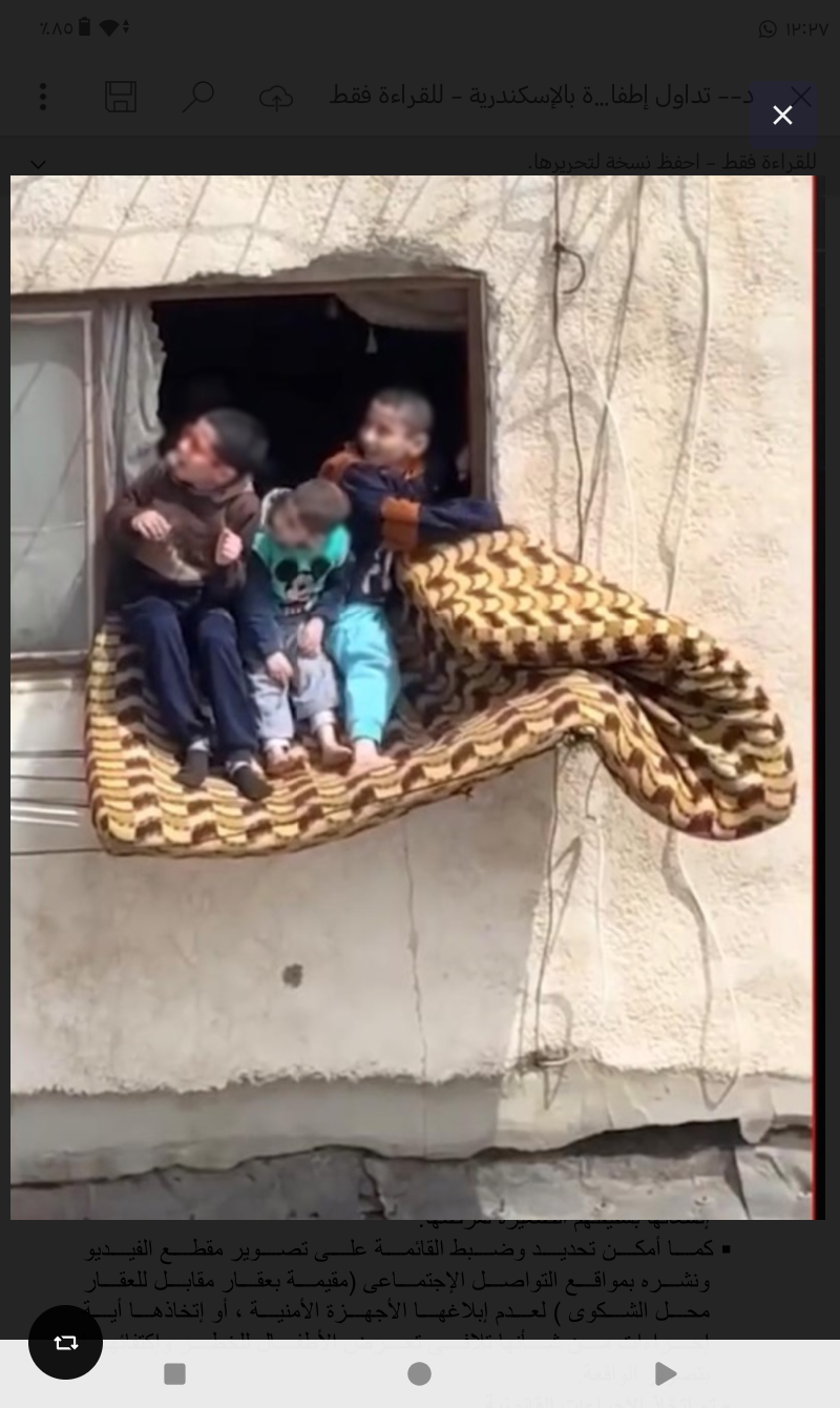 فى إطار كشف ملابسات مقطع فيديو تم تداوله بمواقع التواصل الاجتماعى تضمن قيام بعض الأطفال بالجلوس على مرتبة خارج شباك أحد الطوابق المرتفعة بأحد العقارات بالإسكندرية مما يعرض حياتهم للخطر.