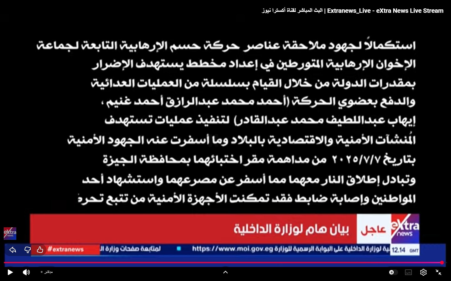 أوضحت الوزارة أن معلومات قطاع الأمن الوطني رصدت مخططاً إرهابياً يستهدف الإضرار بمقدرات الدولة والقيام بسلسلة من العمليات العدائية ضد المنشآت الأمنية والاقتصادية الحيوية.