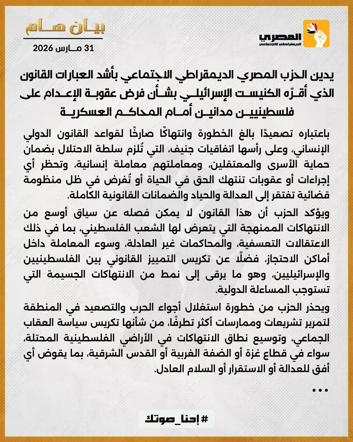 الحزب المصري الديمقراطي الاجتماعي يدين قانون إعدام الفلسطينيين ويصفه بانتهاك صارخ
