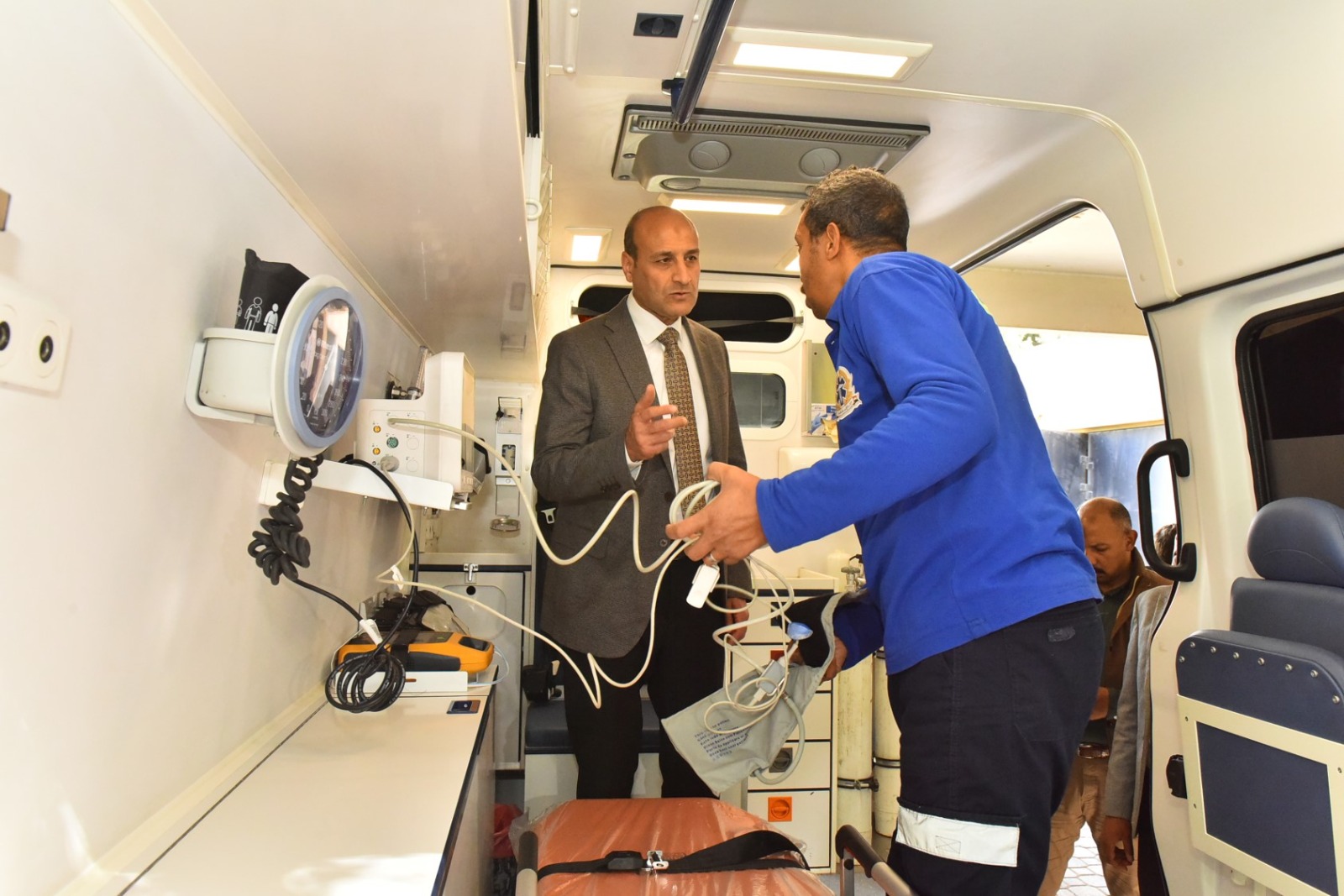كما شملت الجولة تفقد سيارات الإسعاف المتمركزة بالموقع، والتي يبلغ عددها ثلاث سيارات مجهزة بأحدث الإمكانيات الطبية، من بينها سيارة حضانة مخصصة لنقل الأطفال المبسترين مزودة بكبسولة حديثة وأجهزة تنفس صناعي، إلى جانب سيارتين مجهزتين كوحدات عناية مركزة متنقلة، تحتويان على أجهزة إنعاش قلبي رئوي، وأجهزة صدمات كهربائية، وأجهزة متابعة حيوية (مونيتور)، فضلًا عن أجهزة رسم القلب.