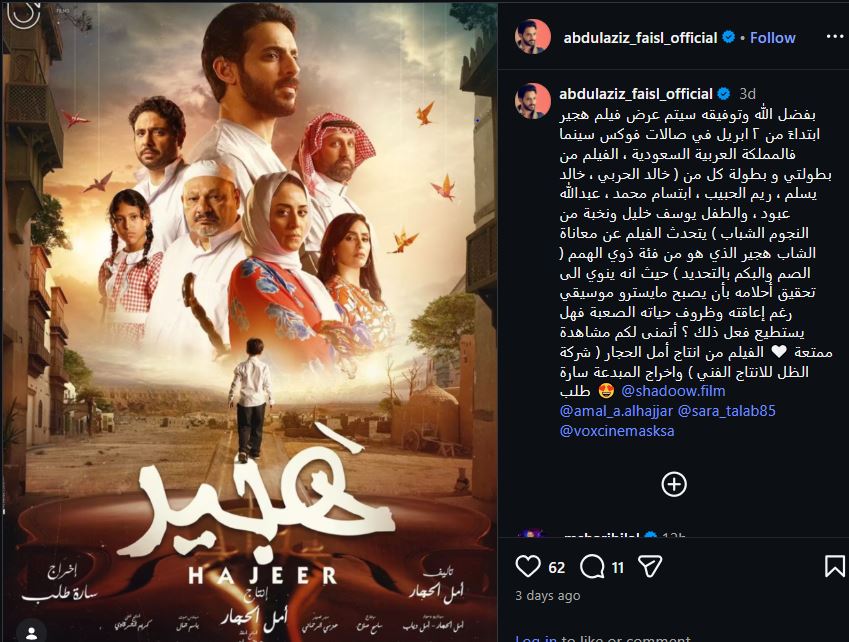 ومن المقرر عرض الفيلم غدًا الموافق الخميس من 2 إبريل، وكتب من خلال صفحته الرسمية عبر موقع الإنستجرام ، وقال: بفضل الله وتوفيقه سيتم عرض فيلم هجير ابتداءً من ٢ ابريل في صالات فوكس سينما فالمملكة العربية السعودية ، الفيلم من بطولتي و بطولة كل من ( خالد الحربي ، خالد يسلم ، ريم الحبيب ، ابتسام محمد ، عبدالله عبود ، والطفل يوسف خليل ونخبة من النجوم الشباب ) يتحدث الفيلم عن معاناة الشاب هجير الذي هو من فئة ذوي الهمم ( الصم والبكم بالتحديد ) حيث انه ينوي الى تحقيق أحلامه بأن يصبح مايسترو موسيقي رغم إعاقته وظروف حياته الصعبة فهل يستطيع فعل ذلك ؟ أتمنى لكم مشاهدة ممتعة الفيلم من انتاج أمل الحجار ( شركة الظل للانتاج الفني ) واخراج المبدعة سارة طلب.