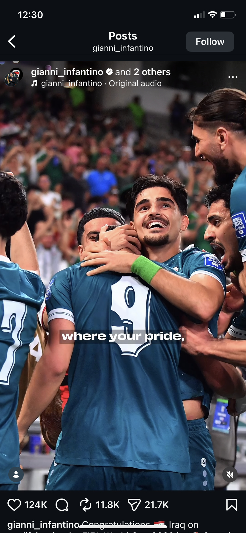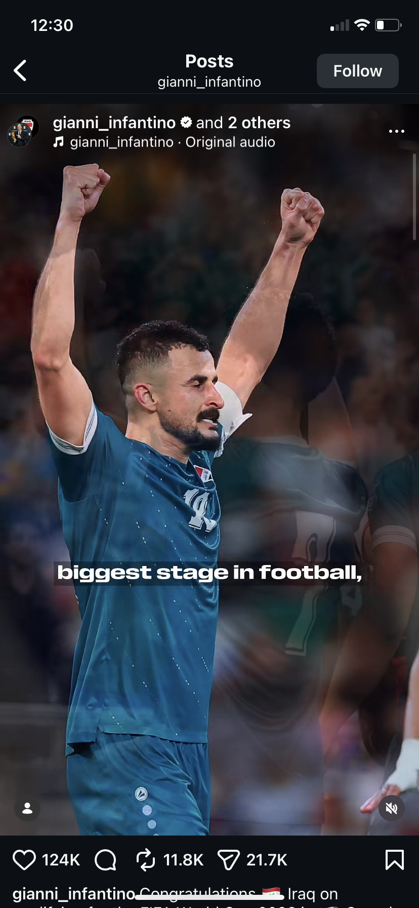 بعد التأهل التاريخي.. إنفانتينو يوجه رسالة خاصة لمنتخب العراق