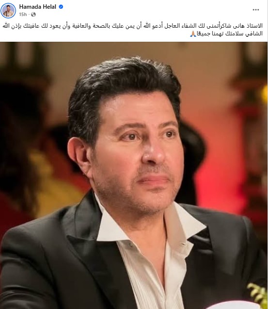 وكتب حمادة هلال من خلال حسابه الرسمي عبر موقع التواصل الاجتماعي فيسبوك: الاستاذ هانى شاكرأتمنى لك الشفاء العاجل أدعو الله أن يمن عليك بالصحة والعافية وأن يعود لك عافيتك بإذن الله الشافي سلامتك تهمنا جميعًا.