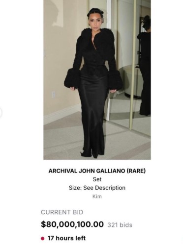 وبحسب ما تداولته وسائل إعلام، أثارت كيم كارداشيان ضجة كبيرة عند ظهورها بهذا الطقم خلال مؤتمر لمنظمة All’s Fair في لوس أنجلوس عام 2025، وهو من تصميم جون غاليانو ويعود إلى مجموعة خريف وشتاء 1995، ومع الإقبال الكبير من المزايدين، ارتفع سعره ليصل إلى نحو 80 مليون دولار، بمشاركة مئات المهتمين، ما يعكس قيمته في عالم الموضة.