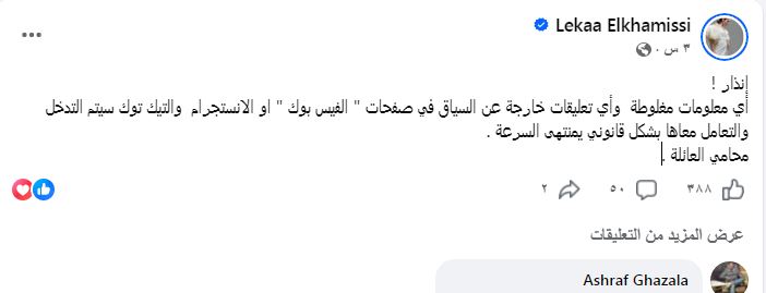 وكتبت لقاء رسالة تحذيرية عبر حسابها الرسمي "فيس بوك" قائلة " إنذار ! أي معلومات مغلوطة وأي تعليقات خارجة عن السياق في صفحات " الفيس بوك " او الانستقرام والتيك توك سيتم التدخل والتعامل معها بشكل قانوني بمنتهى السرعة محامي العائلة".