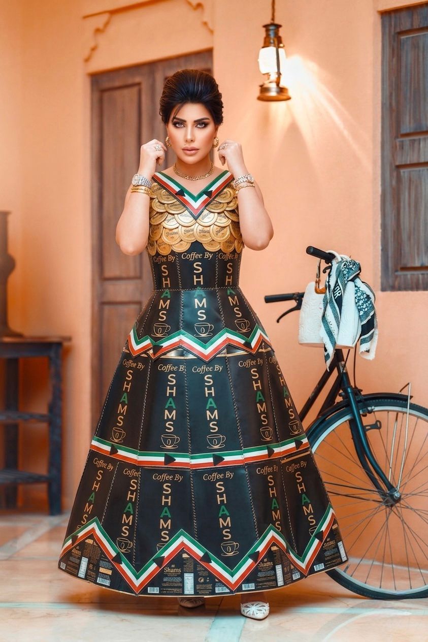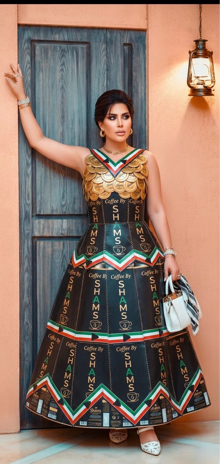 الإطلالة جاءت بتصميم جريء يجمع بين الفن والموضة، حيث تم توظيف عبوات القهوة في تشكيل فستان كامل بتفاصيل هندسية لافتة، مع لمسات ذهبية عند منطقة الصدر، وألوان مستوحاة من هوية المنتج نفسه، ما عكس دمجًا واضحًا بين التسويق والإبداع البصري.