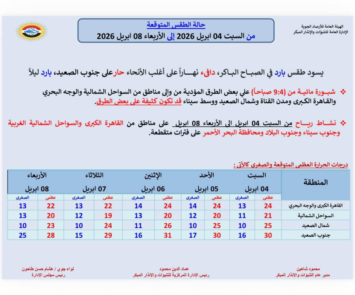 وتؤكد الهيئة العامة للأرصاد الجوية، برئاسة اللواء جوي هشام حسن طاحون، ومتابعة كل من محمود شاهين مدير عام التنبؤات والإنذار المبكر وعماد الدين محمود رئيس الإدارة المركزية للتنبؤات، استمرار المتابعة الدقيقة لحالة الطقس، وإصدار التحديثات بشكل دوري.