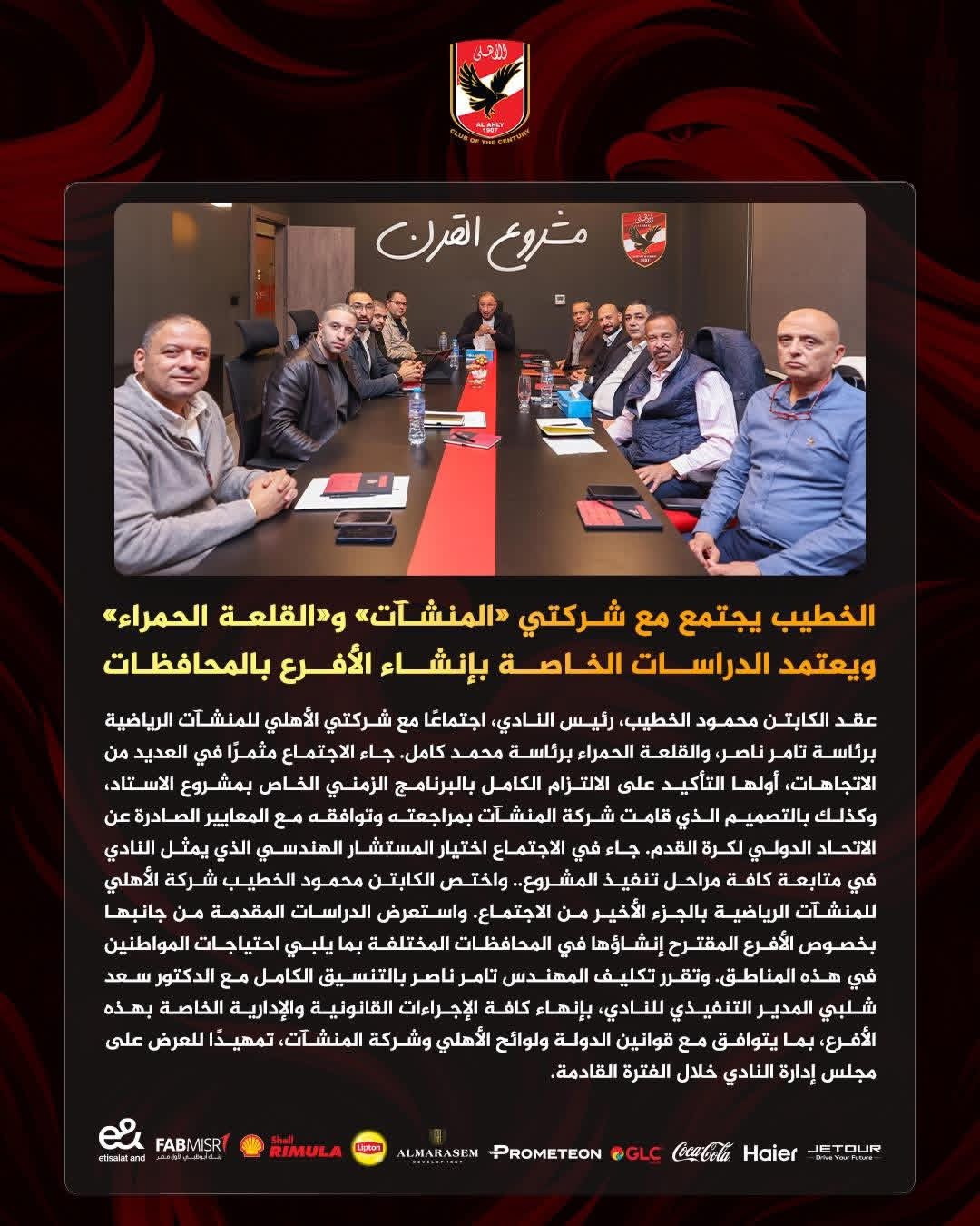 جاء في الاجتماع اختيار المستشار الهندسي الذي يمثل النادي في متابعة كافة مراحل تنفيذ المشروع.. واختص الكابتن محمود الخطيب شركة الأهلي للمنشآت الرياضية بالجزء الأخير من الاجتماع.