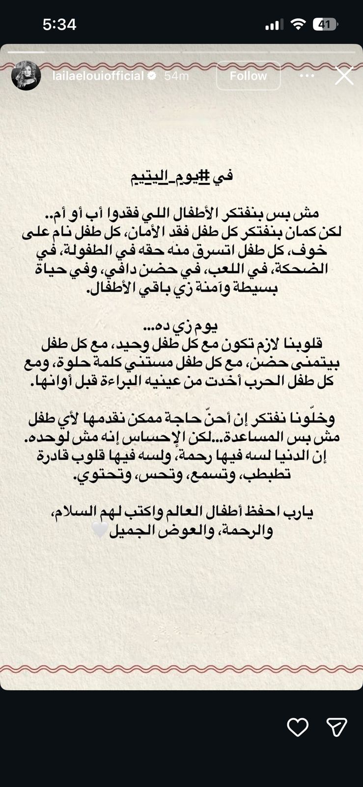 بمناسبة يوم اليتيم، نشرت الفنانة ليلى علوي رسالة إنسانية مؤثرة في استوري عبر صفحتها علي موقع الإنستجرام ، أوضحت فيها أن مفهوم اليُتم لا يقتصر على فقدان الأب أو الأم، بل يمتد ليشمل فقدان الأمان والشعور بالاستقرار.