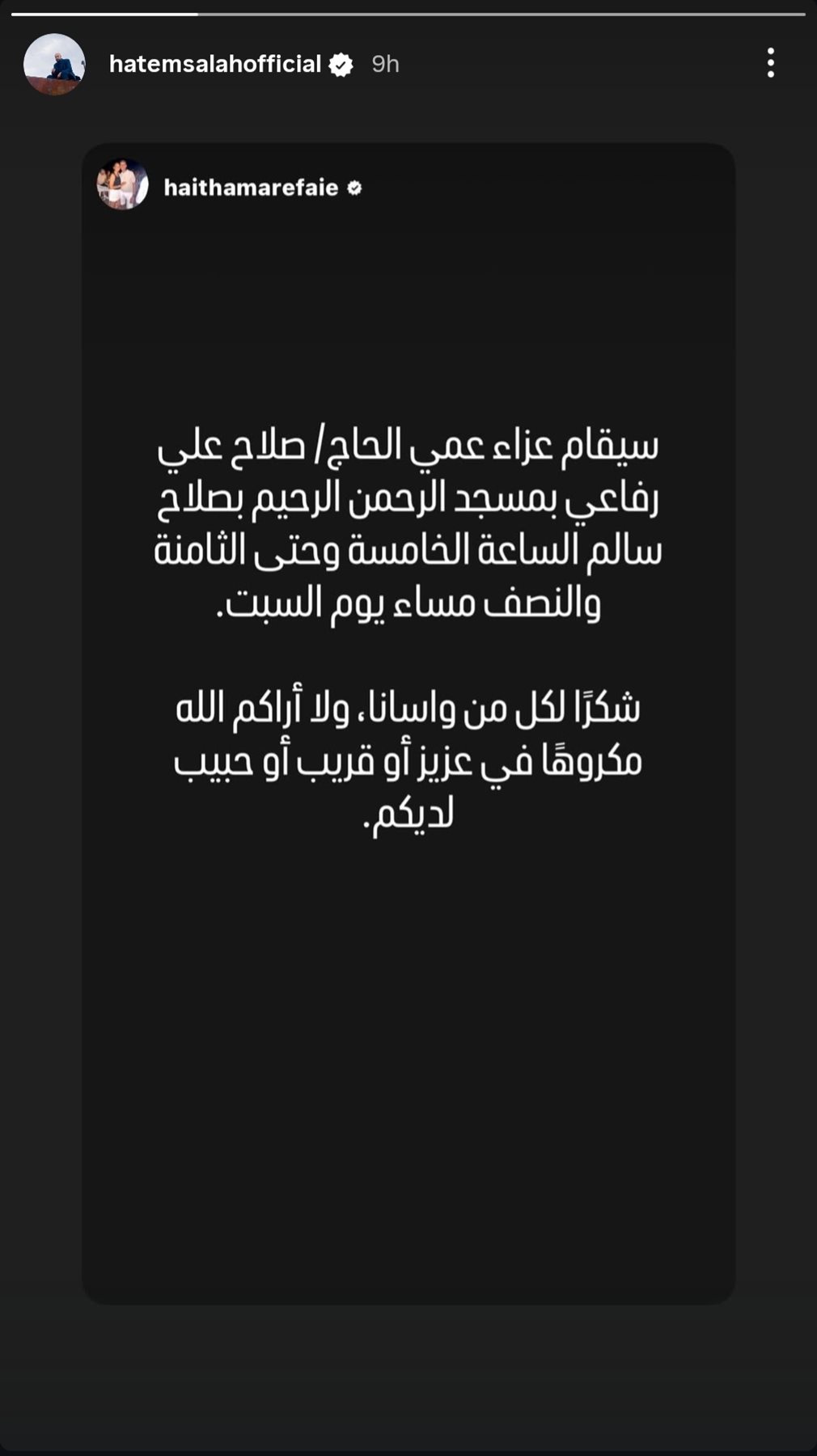 وأعاد حاتم صلاح مشاركة منشور ابن عمه عيثم علي رفاعي، الذي كشف فيه عن موعد ومكان جنازة الراحل، وكتب من خلال حسابه الرسمي عبر موقع تبادل الصور والفيديوهات القصيرة إنستجرام، عبر خاصية ستوري، قال: سيقام عزاء عمي الحاج / صلاح علي رفاعي بمسجد الرحمن الرحيم بصلاحسالم الساعة الخامسة وحتى الثامنة والنصف مساء يوم السبت.