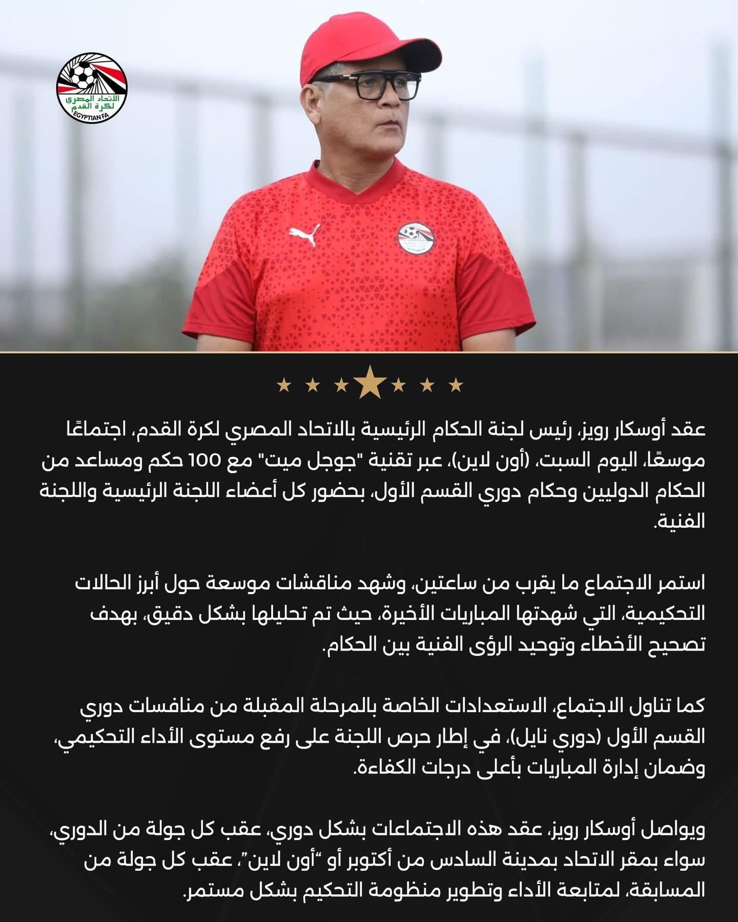 ويواصل أوسكار رويز، عقد هذه الاجتماعات بشكل دوري، عقب كل جولة من الدوري سواء بمقر الاتحاد بمدينة السادس من أكتوبر أو أون لاين"، عقب كل جولة من المسابقة، لمتابعة الأداء وتطوير منظومة التحكيم بشكل مستمر.