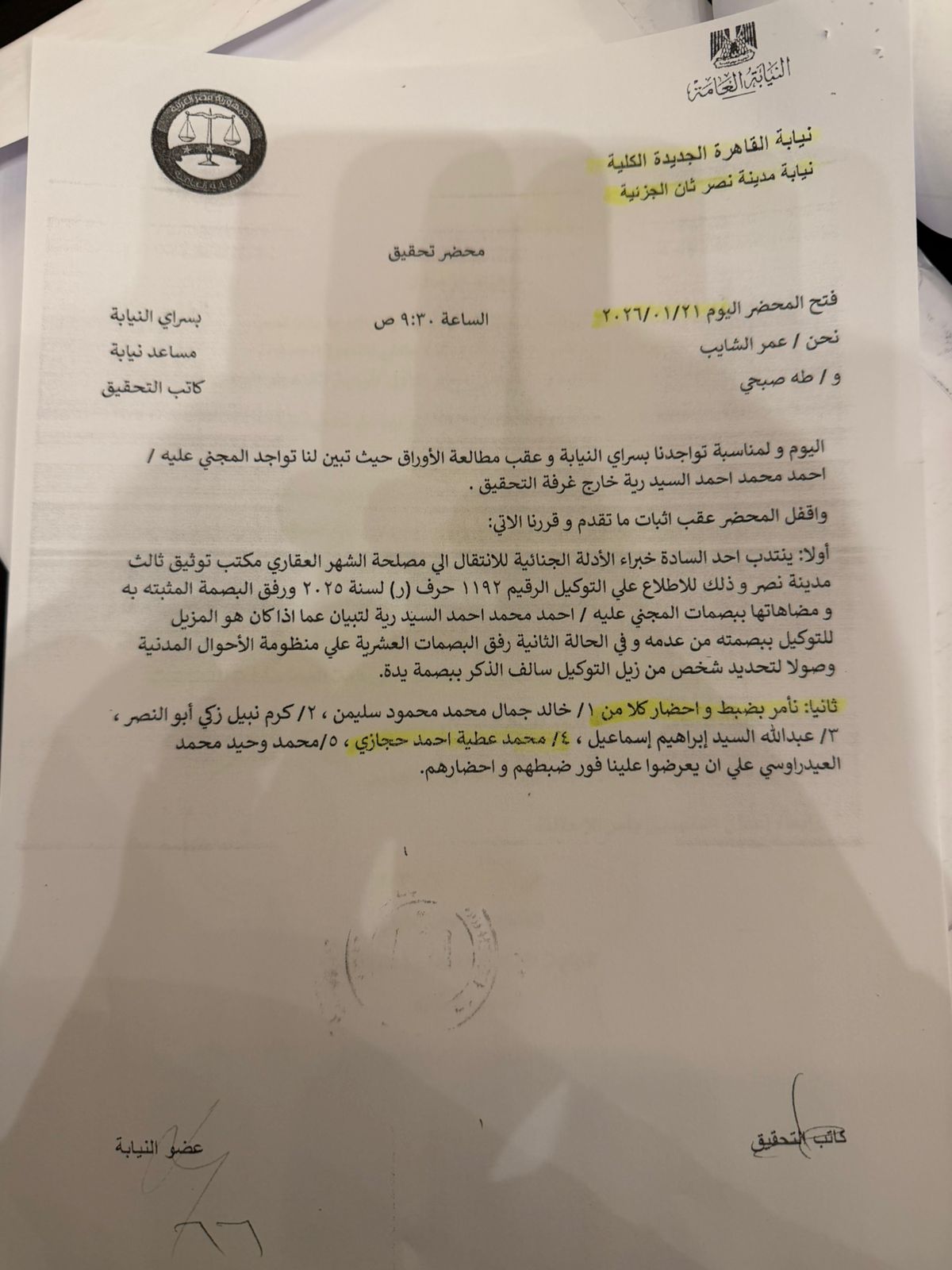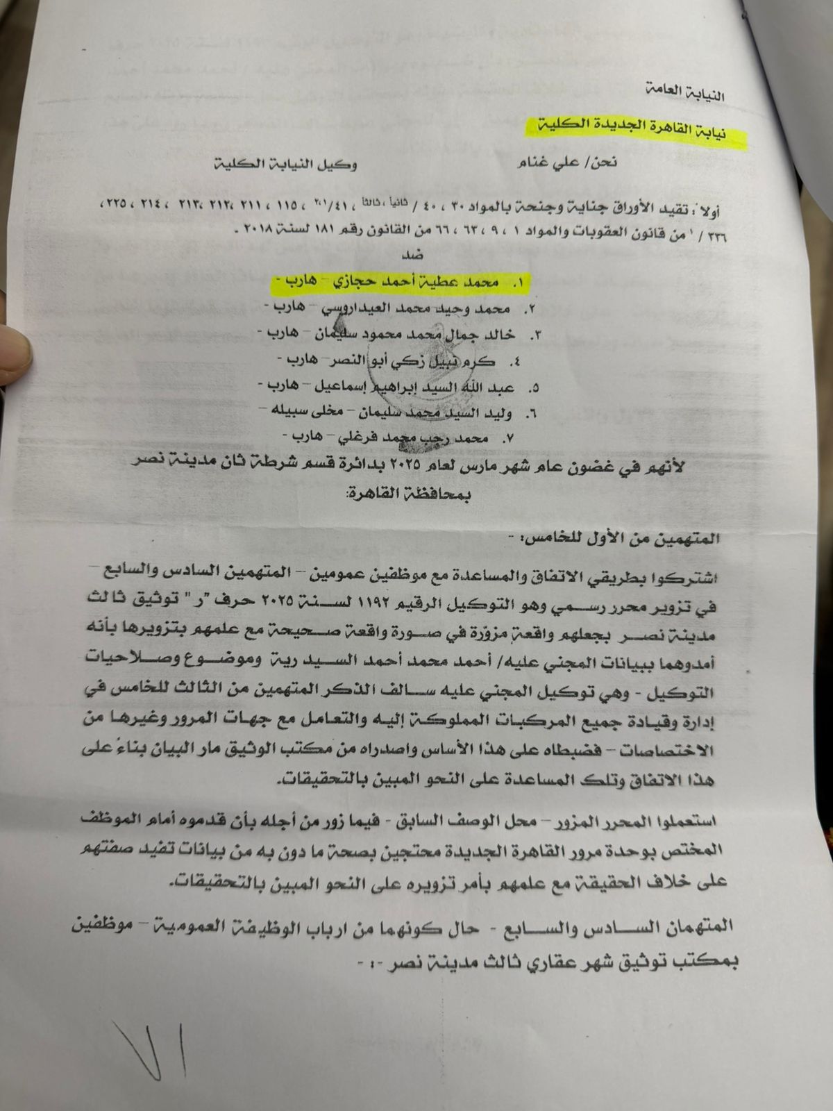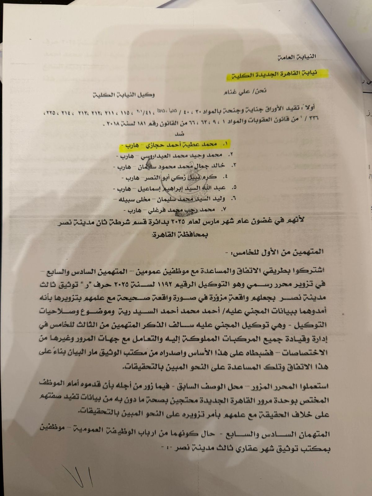وخلال التحقيقات التي باشرتها النيابة العامة، تبين أن المتهمين السادس والسابع اشتركوا بطريقي الاتفاق والمساعدة مع موظفين عمومين في تزوير محرر رسمي، عبارة عن توكيل استخدموه أمام الموظف المختص بوحدة مرور القاهرة الجديدة للاستيلاء على سيارات المجني عليه.