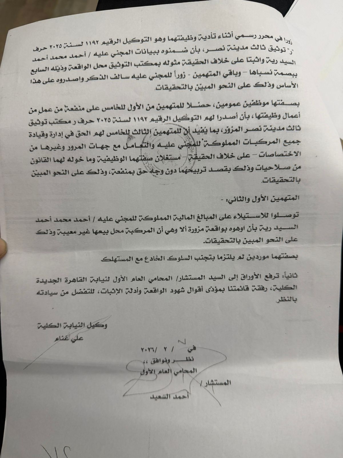 البداية بورود بلاغ إلى الأجهزة الأمنية، من أحمد محمد السيد، بقيام شخصين بتزوير توكيل يحمل رقم 1192 لسنة 2025 حرف «ر» توثيق ثالث مدينة نصر، منسوب للمبلغ، يتيح للمتهمين «خالد.ج» هارب، و«عبدالله.» هارب، بإدارة وقيادة جميع المركبات المملوكة للشاكي والتعامل مع جهات المرورر وغيرها من الاختصاصات.