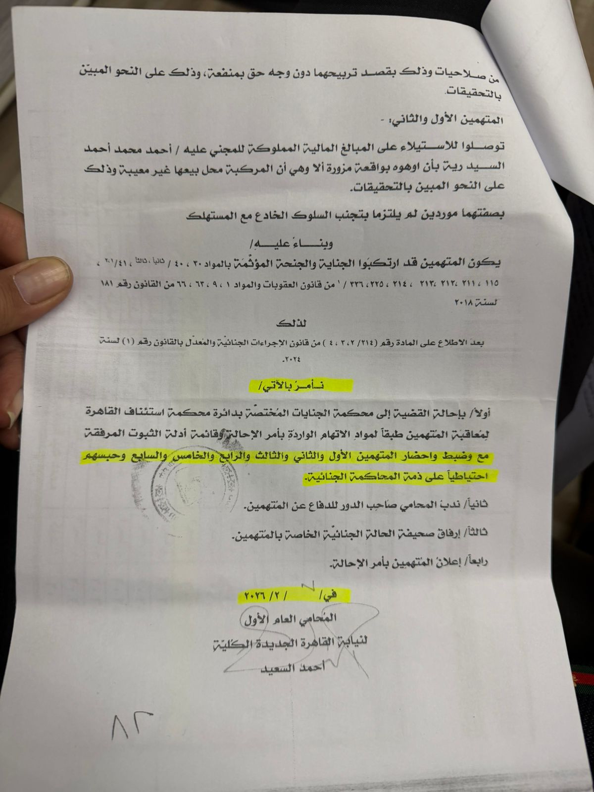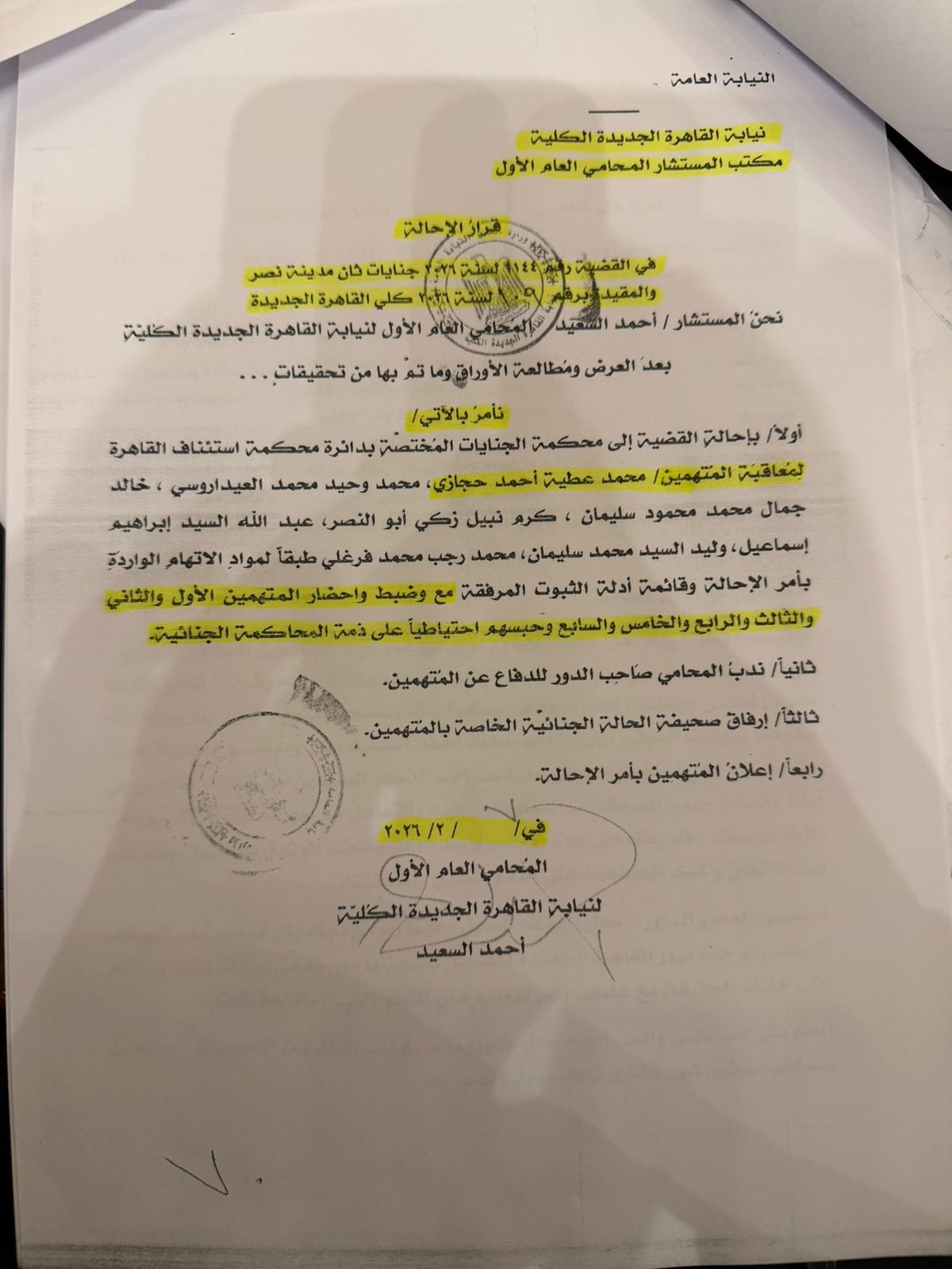 وبعد ثبوت الاتهامات أحالت النيابة أوراق القضية إلى المستشار أحمد السعيد المحامي العام الأول لنيابة القاهرة الجديدة الكلية، والذي أمر بإحالة القضية إلى محكمة الجنايات، وضبط وإحضار المتهمين الهاربين وحبسهم احتياطيا على ذمة المحاكمة، وندب محامي للدفاع عن المتهمين، وإعلان المتهمين بأمر الإحالة.