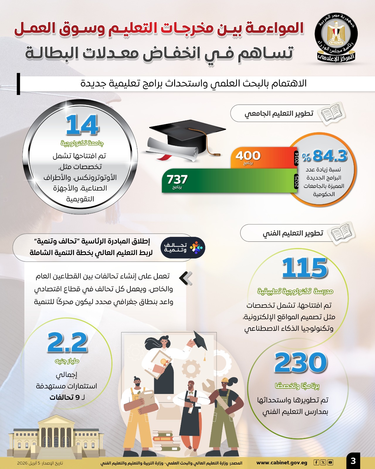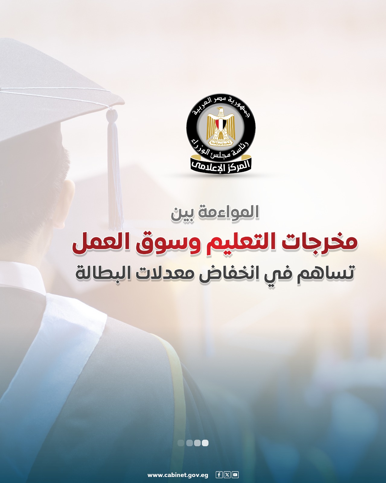 نشر المركز الإعلامي لمجلس الوزراء عددًا من الإنفوجرافات عبر منصاته على مواقع التواصل الاجتماعي، سلط من خلالها الضوء على دور المواءمة بين مخرجات التعليم وسوق العمل في انخفاض معدلات البطالة.