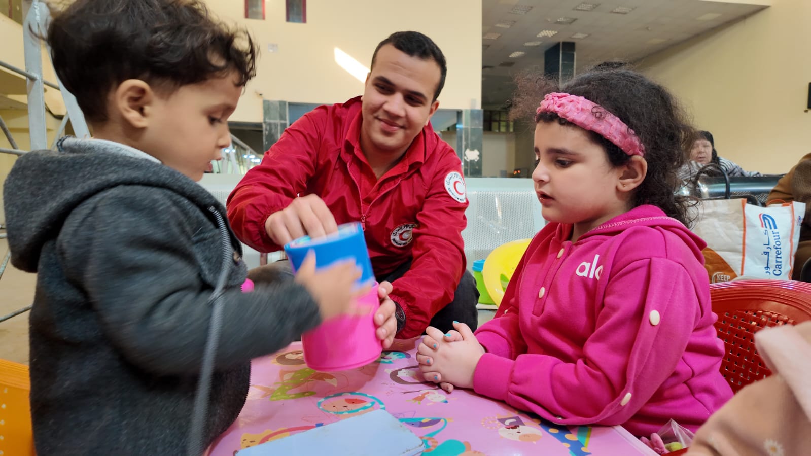 هذا إلى جانب، توزيع الوجبات الغذائية الساخنة، توفير الملابس الثقيلة ومستلزمات العناية الشخصية، وتوزيع «حقيبة العودة» على العائدين إلى القطاع.