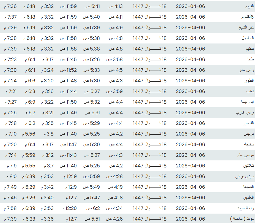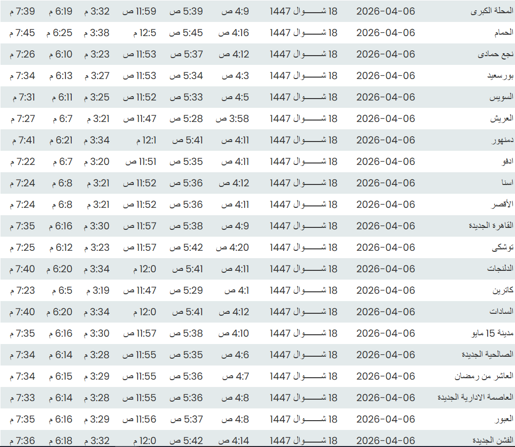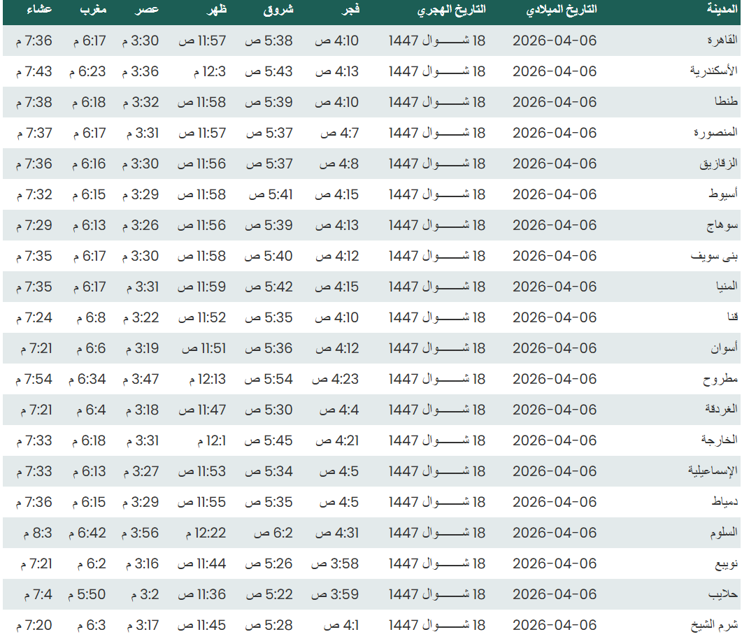 فيما يلي مواقيت الصلاة اليوم الاثنين 6 أبريل 2026 لأبرز المدن المصرية وفقًا للهيئة العامة للمساحة:
