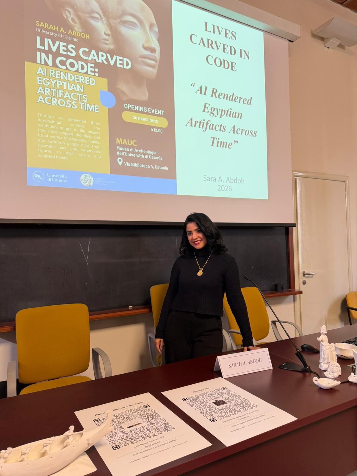 قدمت الدكتورة سارة عبد ربه أستاذ تاريخ الفن بجامعة بنها والزائرة الان بجامعة كاتانيا بإيطاليا تجربة بصرية غير مسبوقة من خلال معرض فنى مبتكر أعادت من خلاله إحياء قطع أثرية ونحتية من الحضارة المصرية القديمة باستخدام تقنيات الذكاء الاصطناعي نجحت من خلاله في خطف أنظار الأوساط الأكاديمية والثقافية في "صقلية" .
