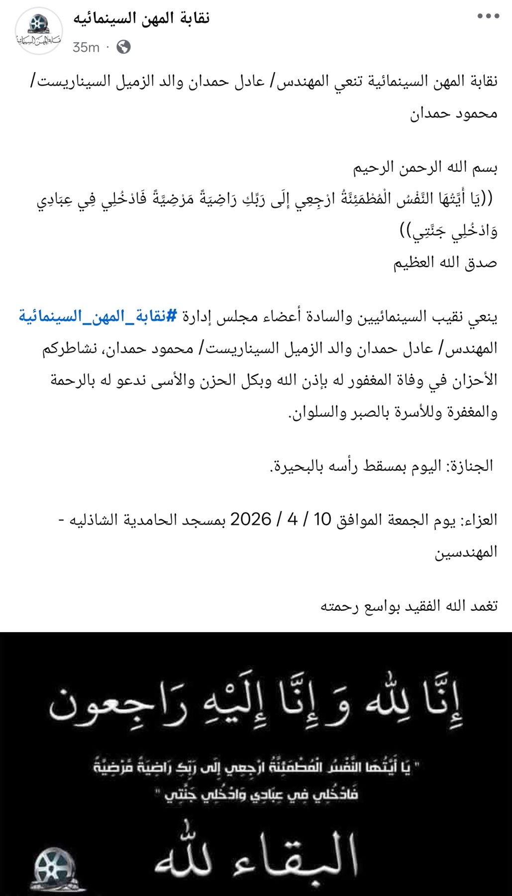 وكتبت نقابة المهن السينمائية من خلال حسابها الرسمي عبر موقع التواصل الاجتماعي فيسبوك، قالت: نقابة المهن السينمائية تنعي المهندس/ عادل حمدان والد الزميل السيناريست/ محمود حمدان.. بسم الله الرحمن الرحيم ((يَا أَيَّتُهَا النَّفْسُ الْمُطْمَئِنَّةُ ارْجِعِي إِلَى رَبِّكِ رَاضِيَةً مَرْضِيَّةً فَادْخُلِي فِي عِبَادِي وَادْخُلِي جَنَّتِي)) صدق الله العظيم.