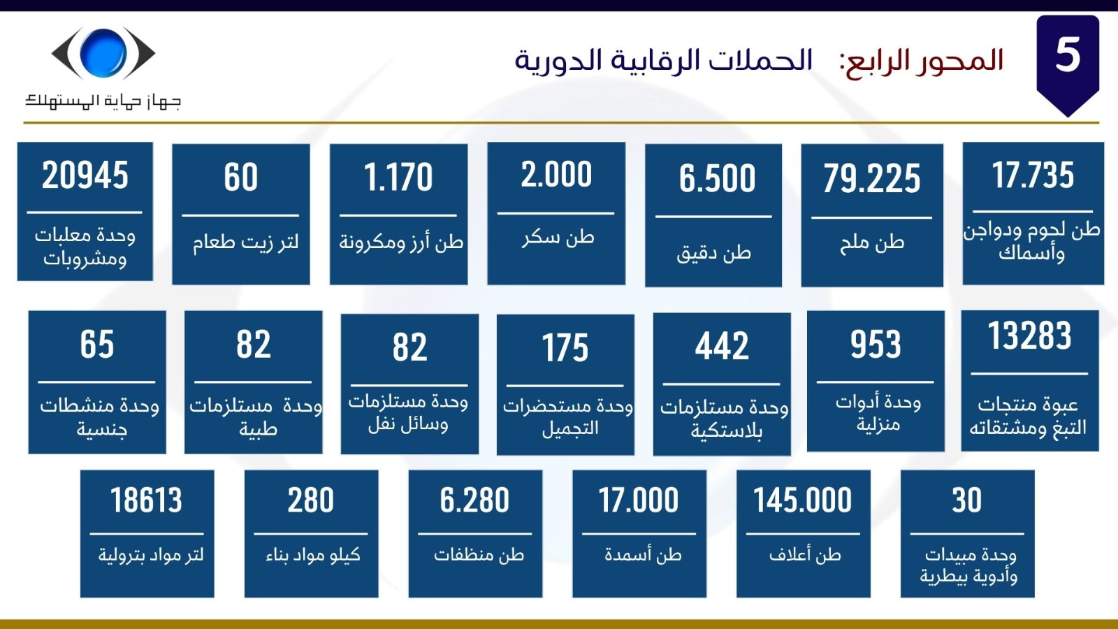 لافتًا إلى أن تلك الجهود أسفرت خلال شهر مارس، عن تنفيذ 731 حملة رقابية على مستوى الجمهورية، شملت المرور على 8,137 منشأة تجارية، وأسفرت عن ضبط 1,921 قضية متنوعة. كما تم ضبط كميات كبيرة من السلع الغذائية المخالفة، بلغ إجماليها نحو 106 أطنان من المنتجات مجهولة المصدر أو منتهية الصلاحية، بالإضافة إلى ما يقرب من 210 ألف وحدة من المعلبات والمشروبات منتهية الصلاحية ، فضلًا عن ضبط 13,283 عبوة من التبغ ومشتقاته مجهولة المصدر، إلى جانب ضبط 162 طنًا من الأعلاف والأسمدة مجهولة المصدر وغير الصالحة للاستخدام.