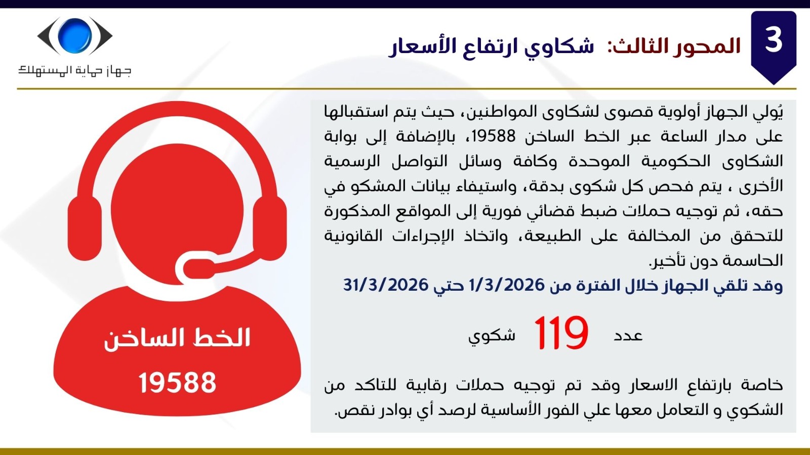 وفيما يخص المحور الثالث المتعلق بتلقي شكاوى المواطنين بمختلف القطاعات، أوضح السيد/ إبراهيم السجيني، أن الجهاز واصل تطوير آليات استقبال وفحص ومعالجة الشكاوى، من خلال منظومة عمل متكاملة تضم الإدارات المركزية والأفرع الإقليمية على مستوى الجمهورية، وتشمل قطاعات السلع المعمرة، والسلع المتنوعة، والاتصالات، والسيارات، والعقارات، والإعلانات المضللة، والخدمات، إلى جانب أعمال التحريات المرتبطة بالشكاوى.