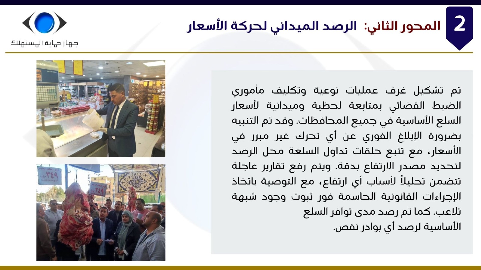 وفيما يخص المحور الثاني المتعلق بالرصد الميداني لحركة أسعار السلع، أوضح "السجيني" أنه تم تشكيل غرف عمليات نوعية تعمل على مدار الساعة لمتابعة تطورات الأسعار في مختلف المحافظات، مع تكليف مأموري الضبط القضائي بمتابعة ميدانية ولحظية للأسواق، خاصة فيما يتعلق بالسلع الأساسية والسلع الأكثر تأثيرًا على المواطن.
