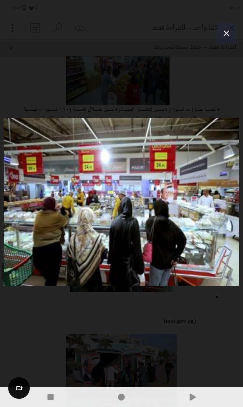 إستمرارًا لفعاليات المرحلة الثامنة والعشرين من مبادرة "كلنا واحد" برعاية السيد رئيس الجمهورية، التي تهدف إلى توفير احتياجات المواطنين من كافة أنواع السلع بتخفيضات كبيرة عبر منافذها المنتشرة على مستوى الجمهورية، وفي إطار حرص وزارة الداخلية على مد فعاليات المبادرة،