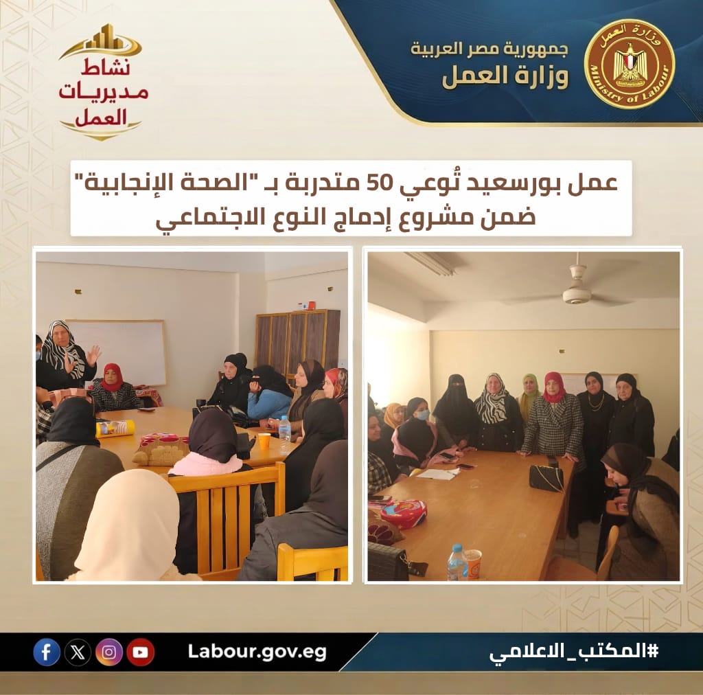تنفيذًا لتوجيهات الوزير حسن رداد بالتمكين الشامل للمرأة؛ نظمت مديرية عمل بورسعيد بقيادة إيمان مسعد، ندوة توعوية حول "الصحة الإنجابية" لـ 50 متدربة بورش (الخياطة، التطريز، والريزن). الندوة التي عُقدت بالتعاون مع "مديرية الشؤون الصحية"، ركزت على ربط السلامة الصحية بالقدرة على الإنتاج، والتوعية بمخاطر الزواج المبكر وختان الإناث. وأكدت المديرية أن هذا النشاط يأتي ضمن مشروع "دعم إدماج النوع الاجتماعي" المنفذ في 4 محافظات، والذي يهدف لبناء قدرات المرأة المعيلة والفتيات (20-55 عاماً) حرفياً وصحياً واجتماعياً، بما يضمن مشاركتهن الفعالة في التنمية المستدامة وفق رؤية مصر 2030.