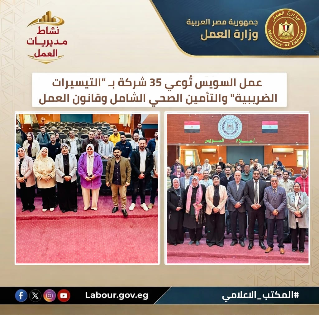 8-"عمل السويس" تُوعي 35 شركة بـ "التيسيرات الضريبية" والتأمين الصحي الشامل على قانون العمل الجديد