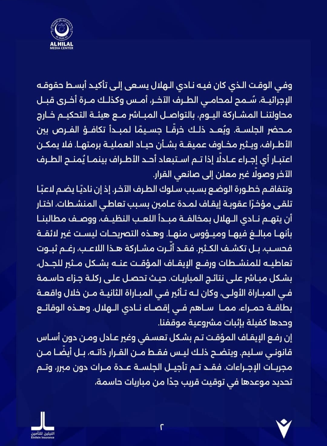 وواصل البيان: وفي الوقت الذي كان فيه نادي الهلال يسعى إلى تأكيد أبسط حقوقه الإجرائية، سمح لمحامي الطرف الآخر، أمس وكذلك مرة أخرى قبل محاولتنا المشاركة اليوم، بالتواصل المباشر مع هيئة التحكيم خارج محضر الجلسة. ويُعد ذلك خرقًا جسيما لمبدأ تكافؤ الفرص بين الأطراف، ويثير مخاوف عميقة بشأن حياد العملية برمتها. فلا يمكن اعتبار أي إجراء عادلا إذا تم استبعاد أحد الأطراف بينما يمنح الطرف الآخر وصولا غير معلن إلى صانعي القرار.