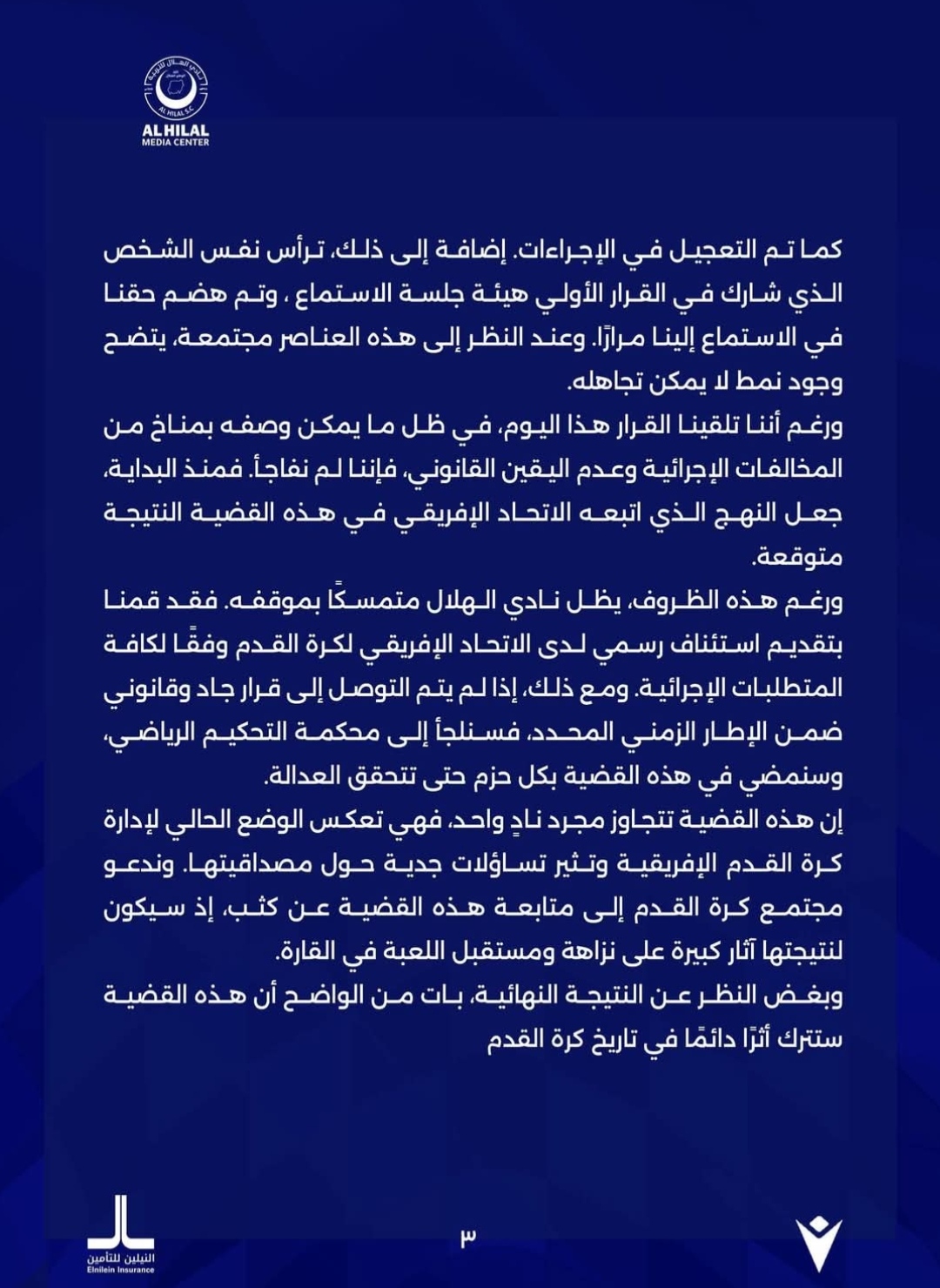 واستكمل: ورغم هذه الظروف، يظل نادي الهلال متمسكا بموقفه. فقد قمنا بتقديم استئناف رسمي لدى الاتحاد الإفريقي لكرة القدم وفقا لكافة المتطلبات الإجرائية. ومع ذلك، إذا لم يتم التوصل إلى قرار جاد وقانوني ضمن الإطار الزمني المحدد، فسنلجأ إلى محكمة التحكيم الرياضي وسنمضي في هذه القضية بكل حزم حتى تتحقق العدالة.