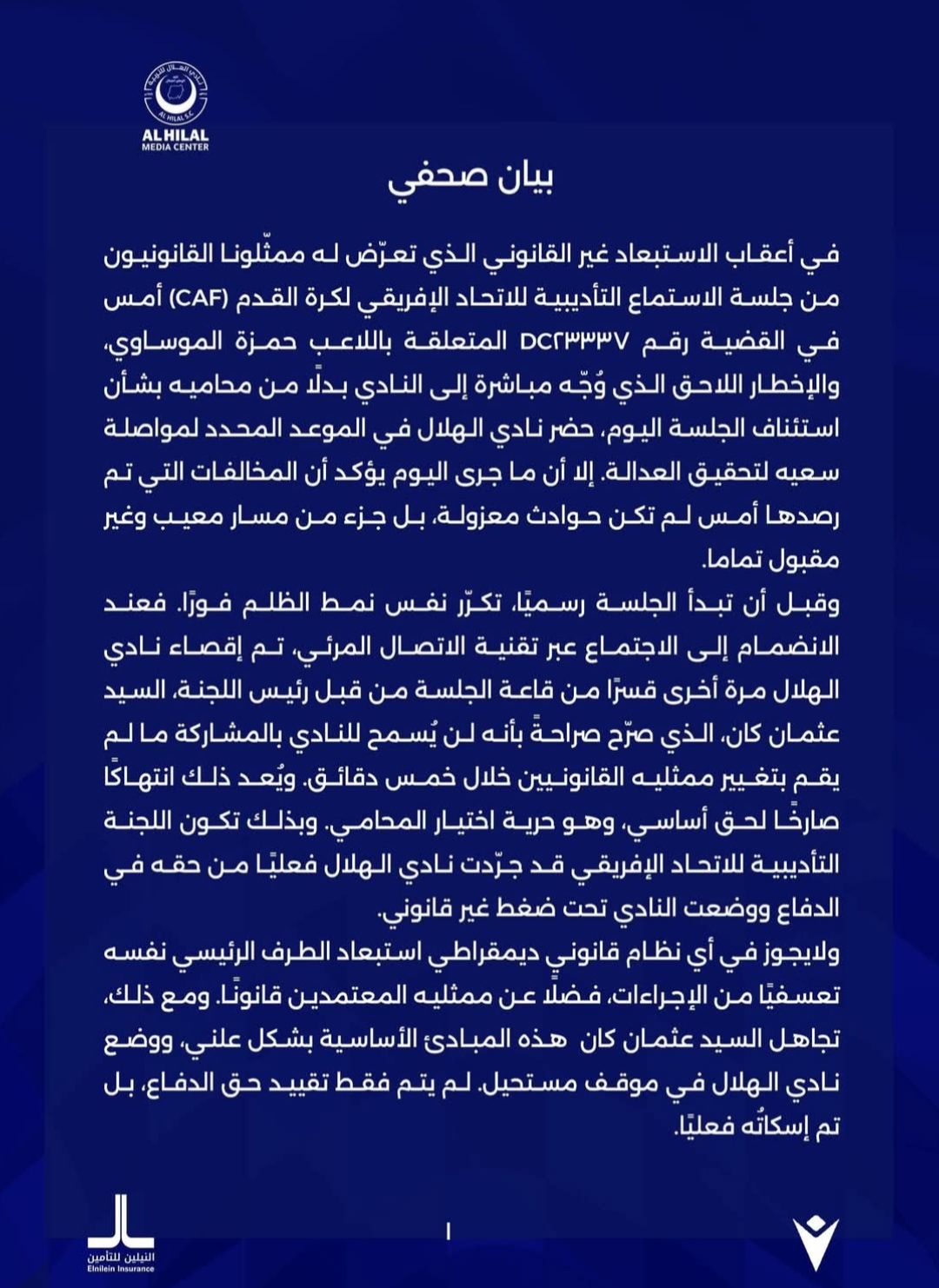 في أعقاب الاستبعاد غير القانوني الذي تعرّض له ممثلونا القانونيون من جلسة الاستماع التأديبية للاتحاد الإفريقي لكرة القدم (CAF) أمس في القضية رقم DC۳۳۳۷ المتعلقة باللاعب حمزة الموساوي والإخطار اللاحق الذي وجه مباشرة إلى النادي بدلا من محاميه بشأن استئناف الجلسة اليوم، حضر نادي الهلال في الموعد المحدد لمواصلة سعيه لتحقيق العدالة. إلا أن ما جرى اليوم يؤكد أن المخالفات التي تم رصدها أمس لم تكن حوادث معزولة، بل جزء من مسار معيب وغير مقبول تماما.