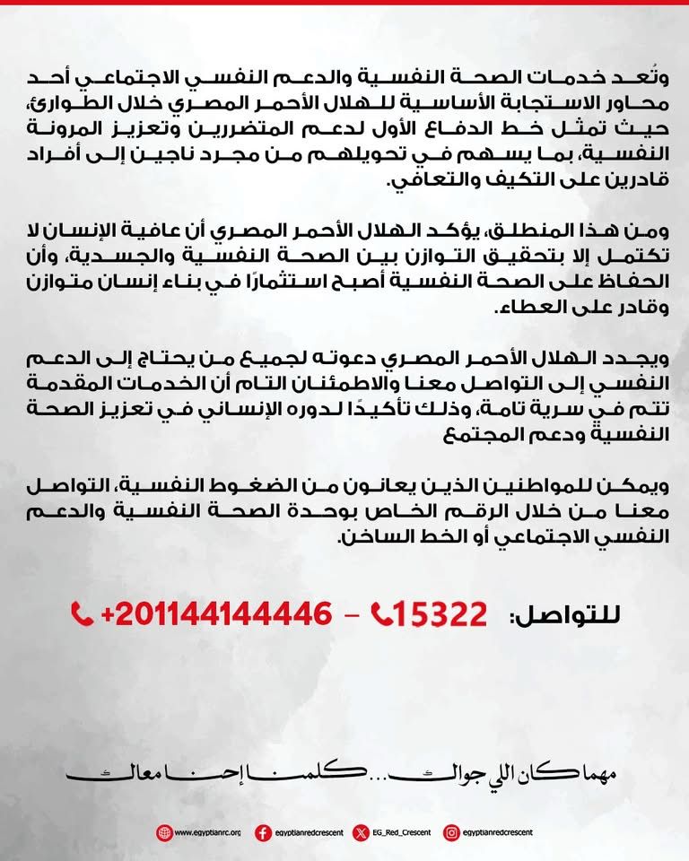 وفي هذا الإطار، يواصل الهلال الأحمر المصري جهوده الإنسانية في تقديم خدمات الصحة النفسية والدعم النفسي الاجتماعي، من خلال غرفة الدعم النفسي عبر الهاتف، كأحد خطوط الاستجابة السريعة التي تهدف إلى تقديم الإسعاف النفسي الأولي وتعزيز قدرة الأفراد على التكيف مع الضغوط والأزمات المختلفة.