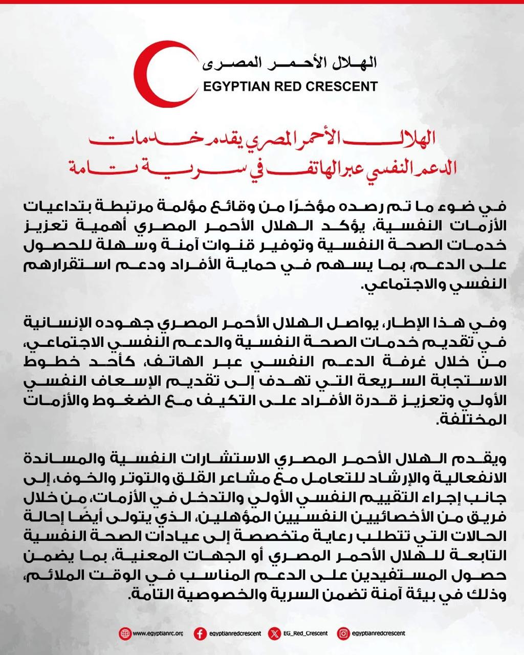 في ضوء ما تم رصده مؤخرًا من وقائع مؤلمة مرتبطة بتداعيات الأزمات النفسية، يؤكد الهلال الأحمر المصري أهمية تعزيز خدمات الصحة النفسية وتوفير قنوات آمنة وسهلة للحصول على الدعم، بما يسهم في حماية الأفراد ودعم استقرارهم النفسي والاجتماعي.