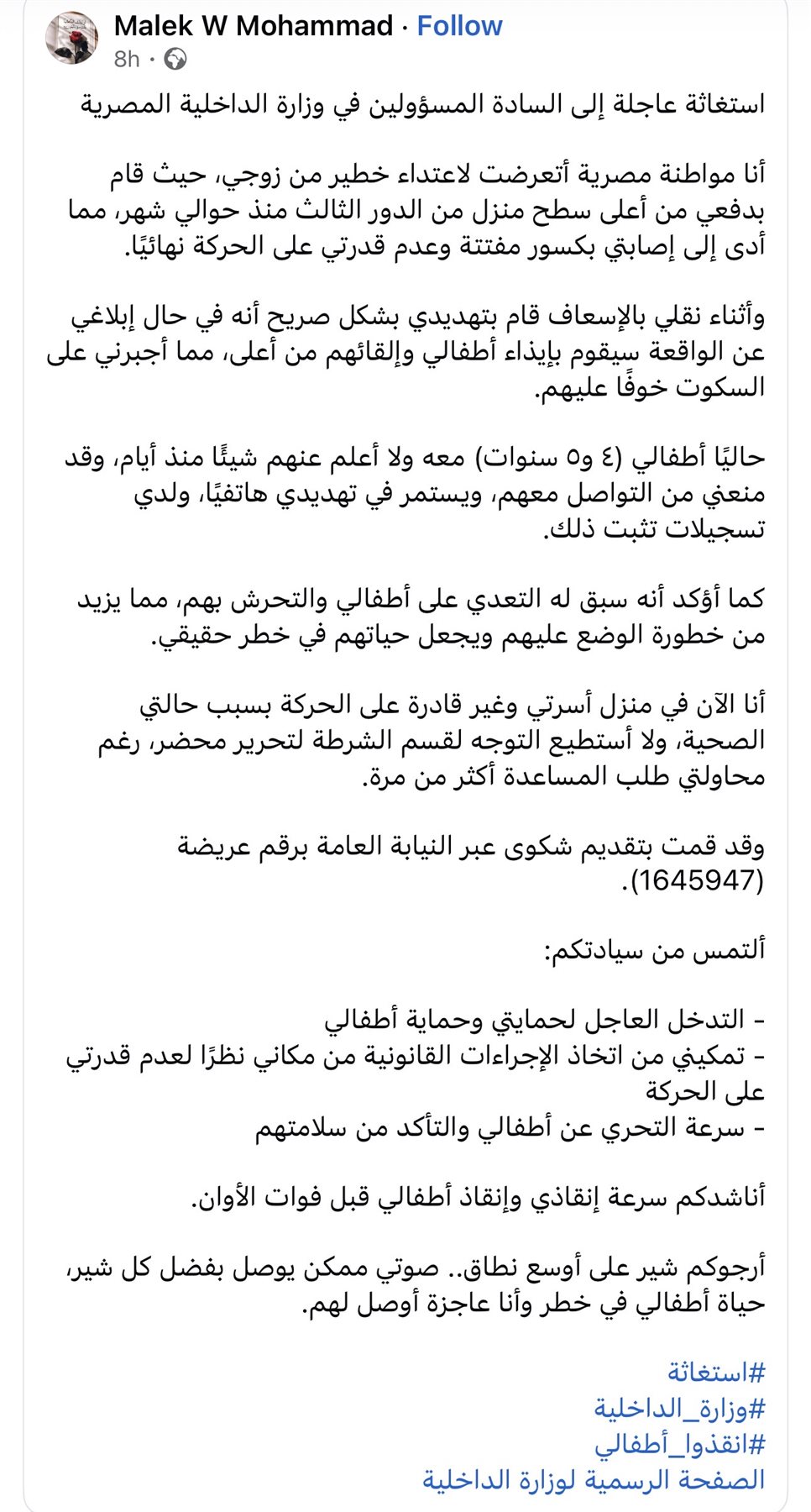 واستطردت: وقد قمت بتقديم شكوى عبر النيابة العامة برقم عريضة (1645947) وألتمس من سيادتكم:التدخل العاجل لحمايتي وحماية أطفالي وتمكيني من اتخاذ الإجراءات القانونية من مكاني نظرًا لعدم قدرتي على الحركة وسرعة التحري عن أطفالي والتأكد من سلامتهم أناشدكم سرعة إنقاذي وإنقاذ أطفالي قبل فوات الأوان.