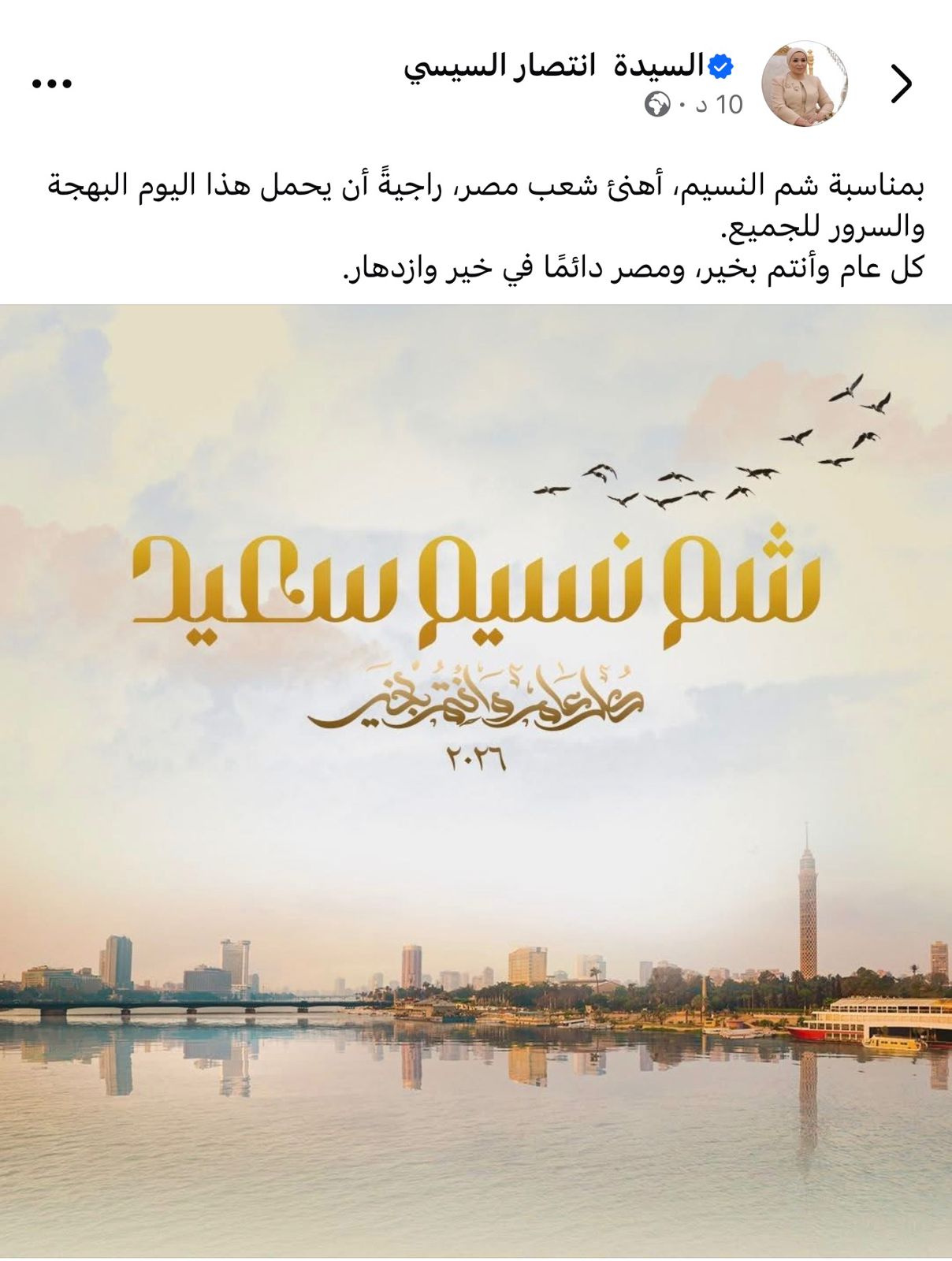 وكتبت السيدة انتصار السيسى، عبر صفحتها الرسمية بموقع التواصل الاجتماعى"فيس بوك": بمناسبة شم النسيم، أهنئ شعب مصر، راجيةً أن يحمل هذا اليوم البهجة والسرور للجميع. كل عام وأنتم بخير، ومصر دائمًا في خير وازدهار".