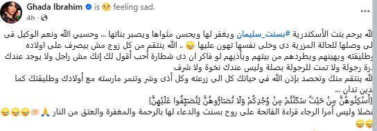 وكتبت غادة إبراهيم من خلال حسابها الرسمي عبر موقع التواصل الاجتماعي فيسبوك: الله يرحم بنت الأسكندرية ويغفر لها ويحسن مثواها ويصبر بناتها.. وحسبي الله ونعم الوكيل فى الى وصلها للحالة المزرية دى وخلى نفسها تهون عليها.. الله ينتقم من كل زوج مش بيصرف على اولاده وطليقته ويهينهم ويطردهم من بيتهم ويأذيهم لو فاكر ان دى شطارة أحب أقول لك إنك مش راجل ولا يوجد عندك ذرة رجولة ولا تمت للرجولة بصلة وليس عندك نخوة ولا شرف.
