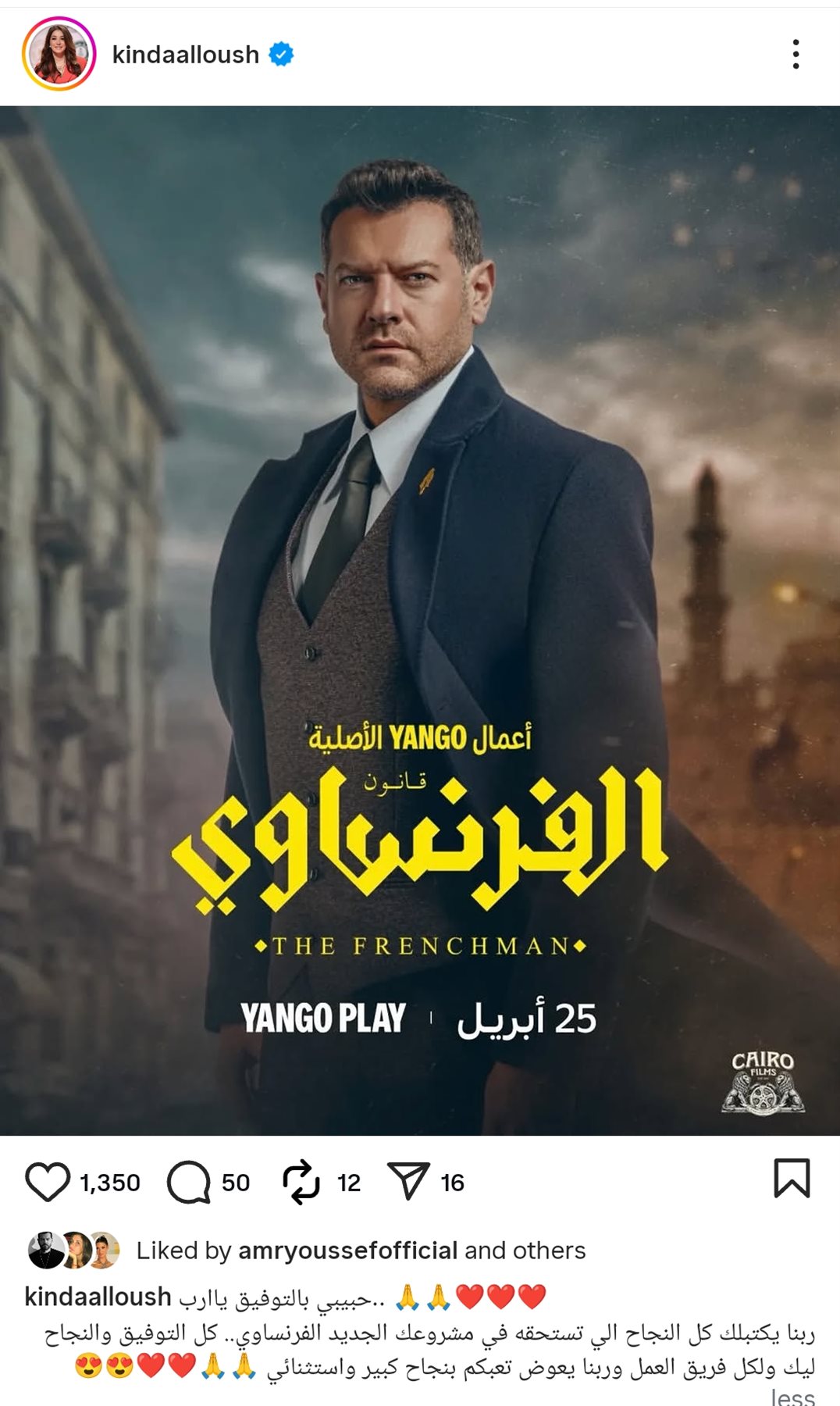 حرصت الفنانة كندة علوش على دعم زوجها الفنان عمرو يوسف، وذلك قبل عرض مسلسله الجديد «الفرنساوي»، الذي من المقرر عرضه الفترة المقبلة على يانجو بلاي.