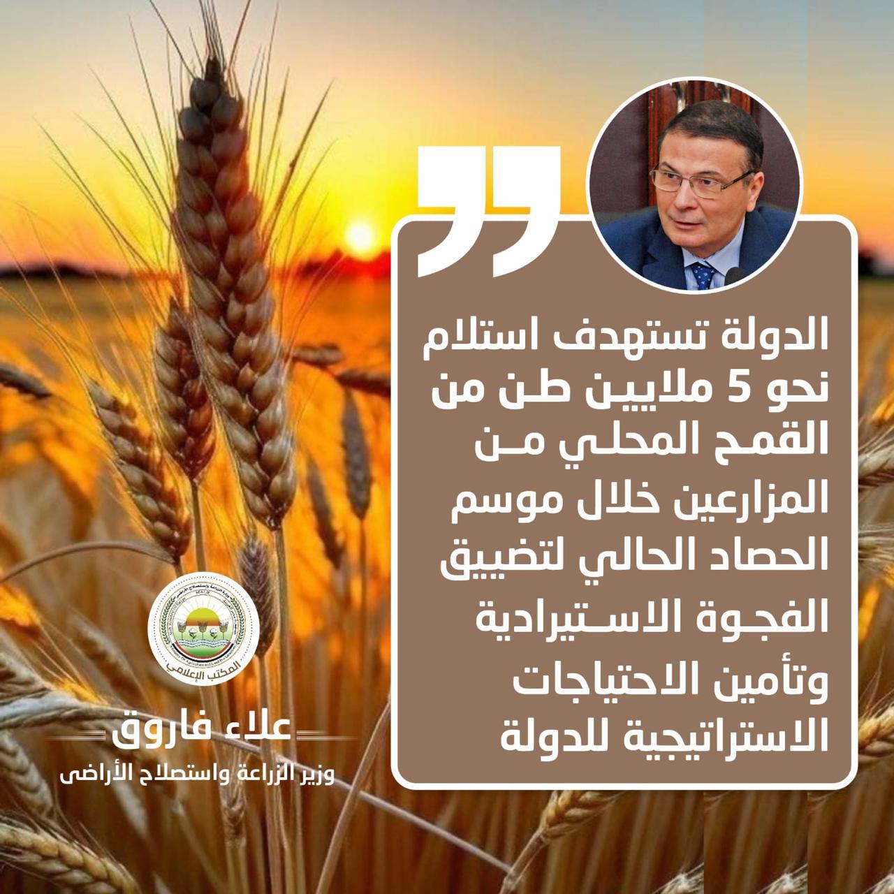 وأكد السيد علاء فاروق وزير الزراعة واستصلاح الأراضي، أن الدولة تستهدف استلام نحو 5 ملايين طن من القمح المحلي من المزارعين خلال موسم الحصاد الحالي، بما يسهم بشكل مباشر في تضييق الفجوة الاستيرادية وتأمين الاحتياجات الاستراتيجية للدولة.