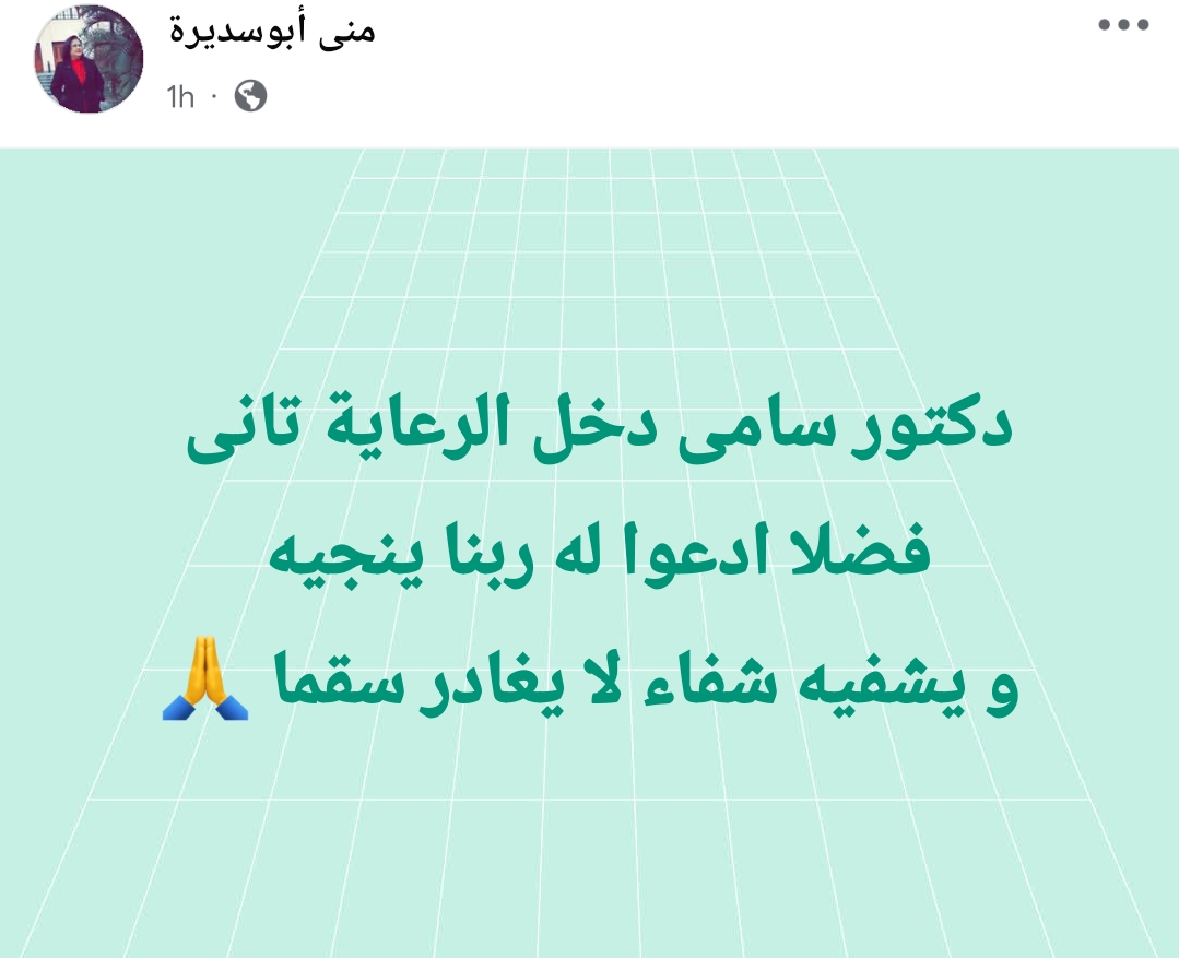 وطالبت منى أبو سديرة بالدعاء لزوجها متمنية له الشفاء العاجل، وكتبت من خلال حسابها الرسمي عبر موقع التواصل الاجتماعي فيسبوك، قالت: دكتور سامى دخل الرعاية تانى.. فضلا ادعوا له ربنا ينجيه، و يشفيه شفاء لا يغادر سقما.