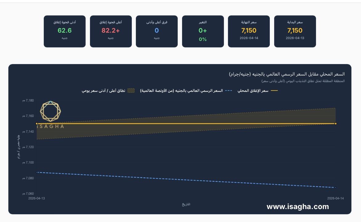 وكشفت منصة «آي صاغة» لتداول الذهب والمجوهرات عبر الإنترنت عن استقرار سعر جرام الذهب عيار 21 الأكثر تداولاً في مصر عند 7,150 جنيهاً، دون تسجيل أي تغيير يُذكر (0%) خلال الفترة محل الرصد، كما سجل سعر جرام الذهب عيار 24 نحو 8,150 جنيهاً، بينما بلغ سعر عيار 18 نحو 6,100 جنيه، مع الحفاظ على الفروق السعرية التقليدية بين الأعيرة المختلفة، في حين ارتفعت الأونصة العالمية بنحو 0.75%، رغم التحركات الصعودية المحدودة التي شهدتها الأسواق العالمية.