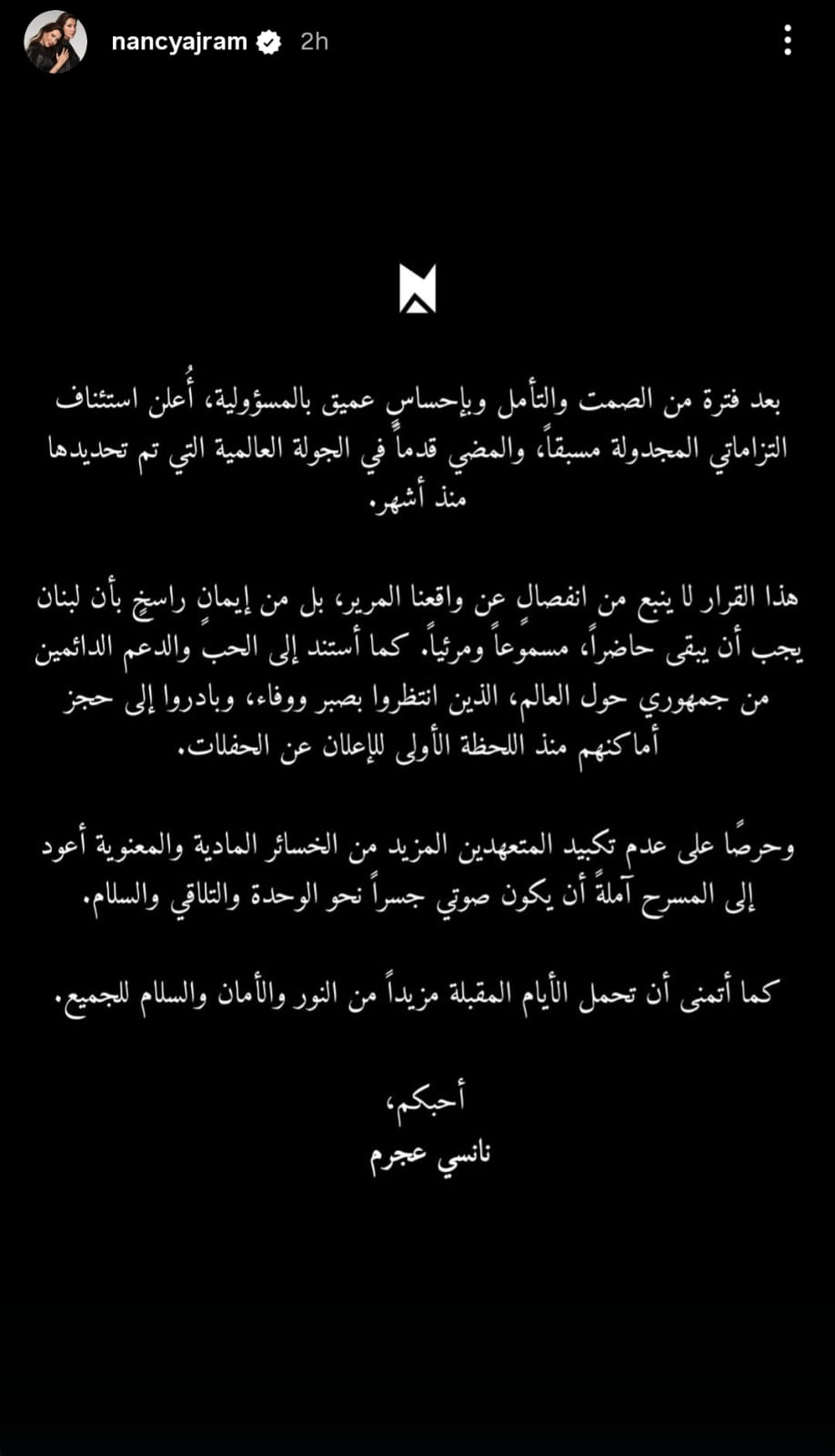 وكتبت نانسي عجرم من خلال حسابها الرسمي عبر موقع تبادل الصور والفيديوهات القصيرة إنستجرام، عبر خاصية ستوري: بعد فترة من الصمت والتأمل وبإحساس عميق بالمسؤولية، أُعلن استئناف التزاماتي المجدولة مسبقاً، والمضي قدماً في الجولة العالمية التي تم تحديدها منذ أشهر.