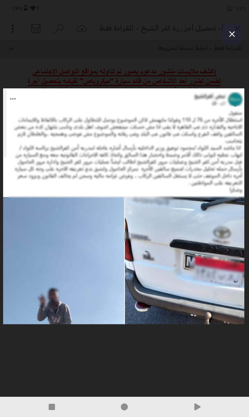 كشفت الأجهزة الأمنية بوزارة الداخلية ملابسات منشور مدعوم بصور تم تداوله بمواقع التواصل الإجتماعى تضمن تضرر أحد الأشخاص من قائد سيارة "ميكروباص" لقيامه بتحصيل أجرة أزيد من المقرر وقيامه بإعتلاء السيارة وتوجيه إشارات خادشة للحياء للركاب حال إعتراضهم على ذلك وقيامهم بتصويره بكفر الشيخ.