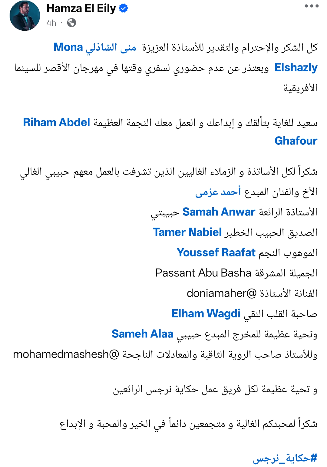 تابع: والأستاذة الرائعة سماح أنور حبيبتي، الصديق الحبيب الخطير تامر نبيل، الموهوب النجم يوسف رأفت، الجميلة المشرقة بسنت أبو باشا، الفنانة الأستاذة دنيا ماهر، صاحبة القلب النقي إلهام وجدي، وتحية عظيمة للمخرج المبدع حبيبي سامح علاء، وللأستاذ صاحب الرؤية الثاقبة والمعادلات الناجحة محمد، و تحية عظيمة لكل فريق عمل حكاية نرجس الرائعين، شكراً لمحبتكم الغالية و متجمعين دائماً في الخير والمحبة و الإبداع.