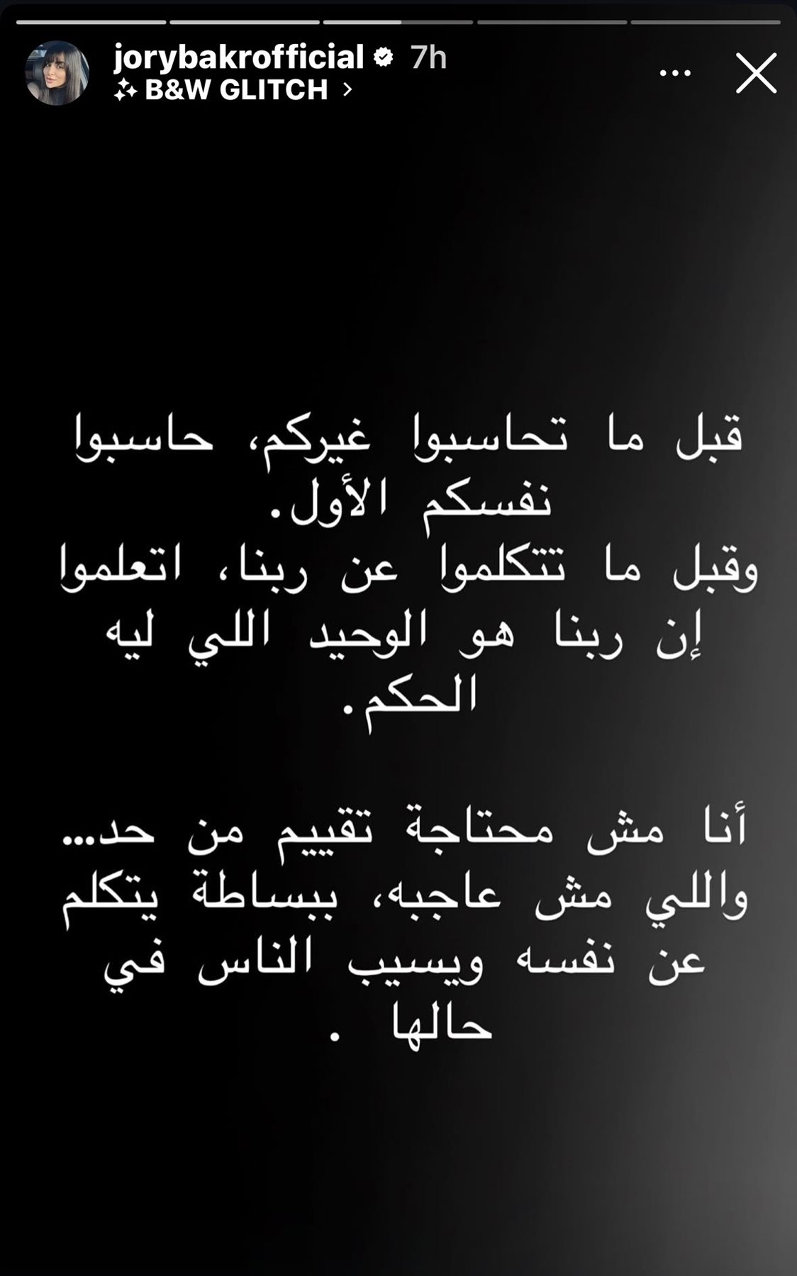ووجهت جوري بكر، عبر حسابها الرسمي بموقع تداول الصور والفيديوهات «إنستجرام»، رسالة حادة تتضمن الأتي: «أي مخلوق هيدخل يهينّي أو يتسبب لي في أذى نفسي هلجأ للقضاء، وشكرًا».