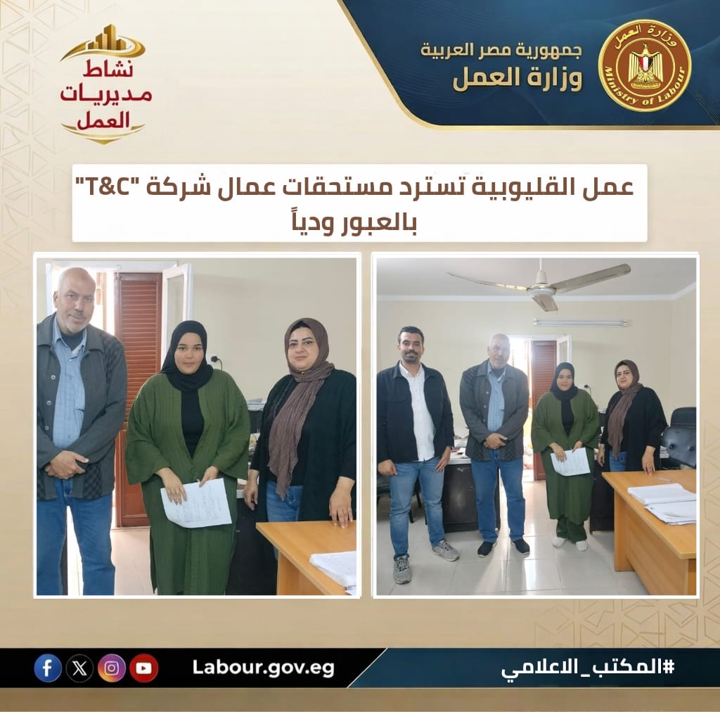 تنفيذًا لتوجيهات وزير العمل حسن رداد، نجحت مديرية عمل القليوبية، بقيادة فوزي صابر، في إتمام تسوية ودية لصالح عمال شركة "T&C" بالعبور. وأسفرت الجهود عن استلام العمال لمستحقاتهم المالية التي بلغت 23 ألف جنيه، تعزيزاً للحوار الاجتماعي وحماية حقوق العمال دون اللجوء للقضاء.
