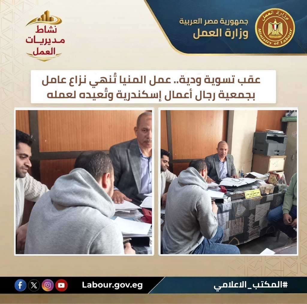 تنفيذًا لتوجيهات وزير العمل حسن رداد، نجحت مديرية عمل المنيا، بإشراف مدير المديرية، في إتمام تسوية قانونية لشكوى عامل بجمعية رجال أعمال إسكندرية. وأسفرت الوساطة عن استرداد العامل لمستحقاته المالية وعودته لممارسة مهامه فوراً، حرصاً على استقرار علاقات العمل دون اللجوء للتقاضي.