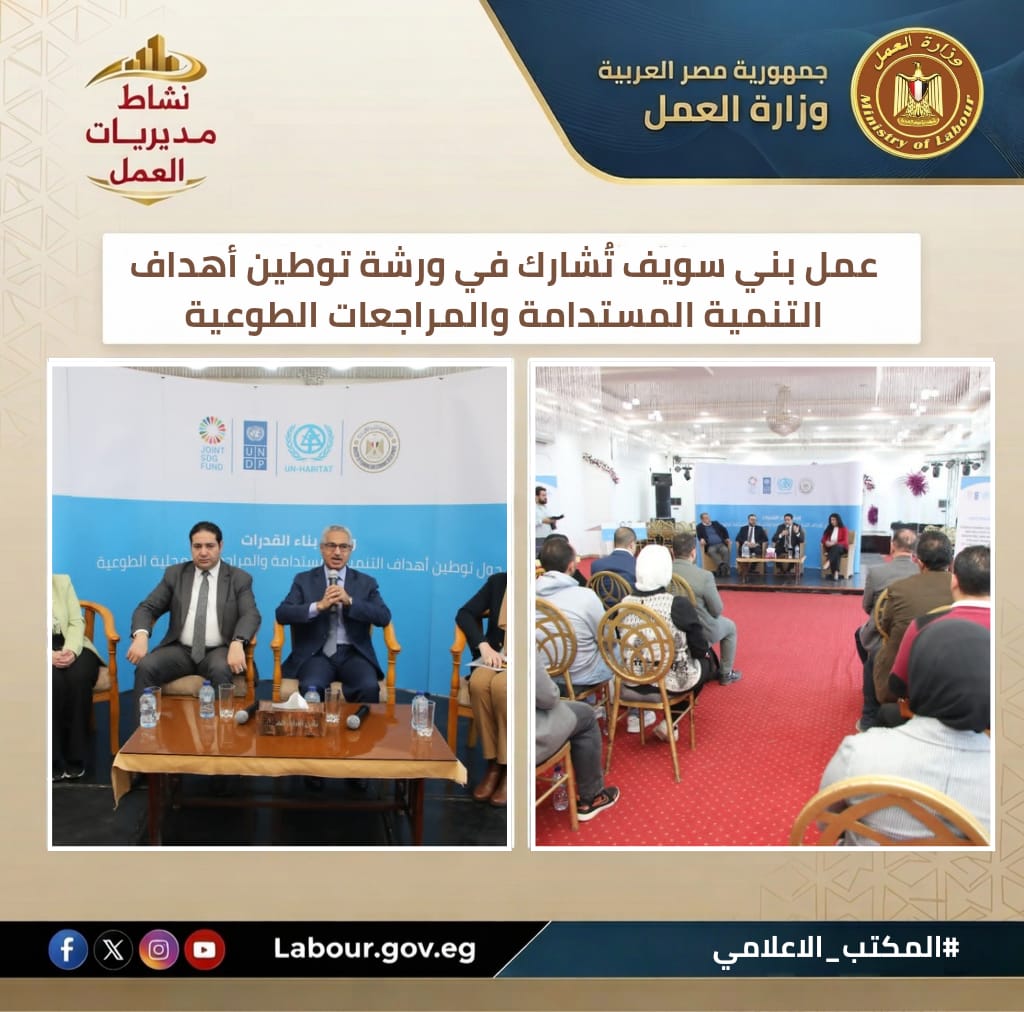 تنفيذًا لتوجيهات وزير العمل حسن رداد، شارك المهندس أحمد العربي، مدير مديرية عمل بني سويف، في ورشة عمل حول "بناء القدرات وتوطين أهداف التنمية المستدامة".