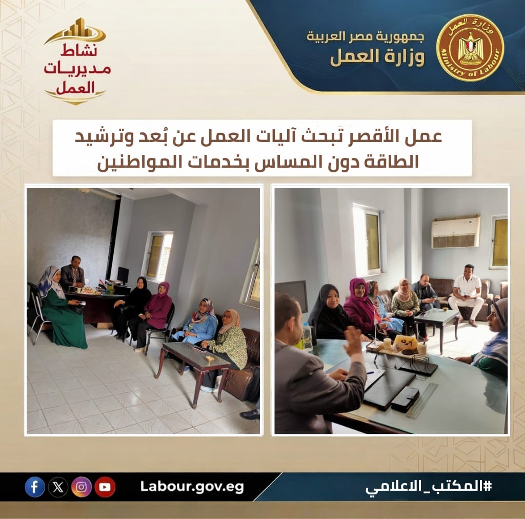 تنفيذًا لتوجيهات وزير العمل حسن رداد، عقد محمود باسل، وكيل وزارة العمل بالأقصر، اجتماعاً لبحث تطبيق نظام "العمل عن بُعد" وترشيد الطاقة. وأكد على وضع معايير واضحة لقياس الأداء لضمان استمرارية تقديم الخدمات للمواطنين بجودة عالية تماشياً مع مستهدفات رؤية مصر 2030.