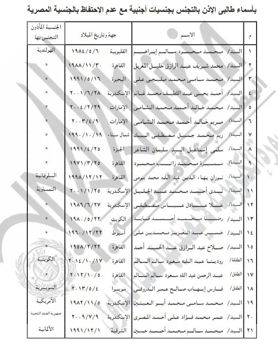 نشرت الجريدة الرسمية اليوم، قرار وزارة الداخلية بالإذن لـ21 شخصا بالتجنس بجنسيات أجنبية، مع عدم احتفاظهم بالجنسية المصرية.
